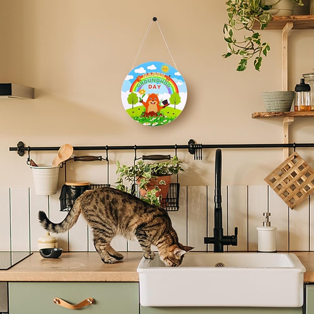 Groundhog Day Decorations Sign 12" Welcome Sign for Front Door Decoration Round Wooden Groundhog Hanging Door Sign Plaque for Groundhog Day Party Supplies Porch Wall Decor
