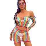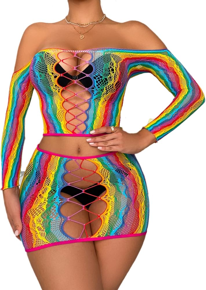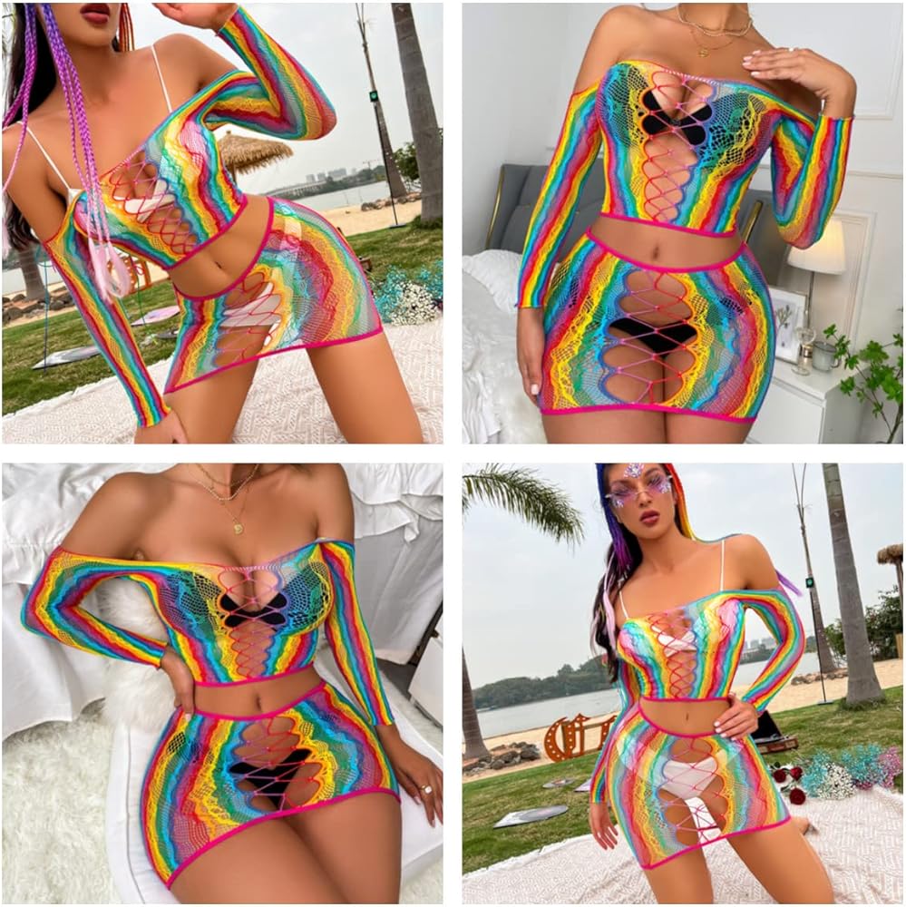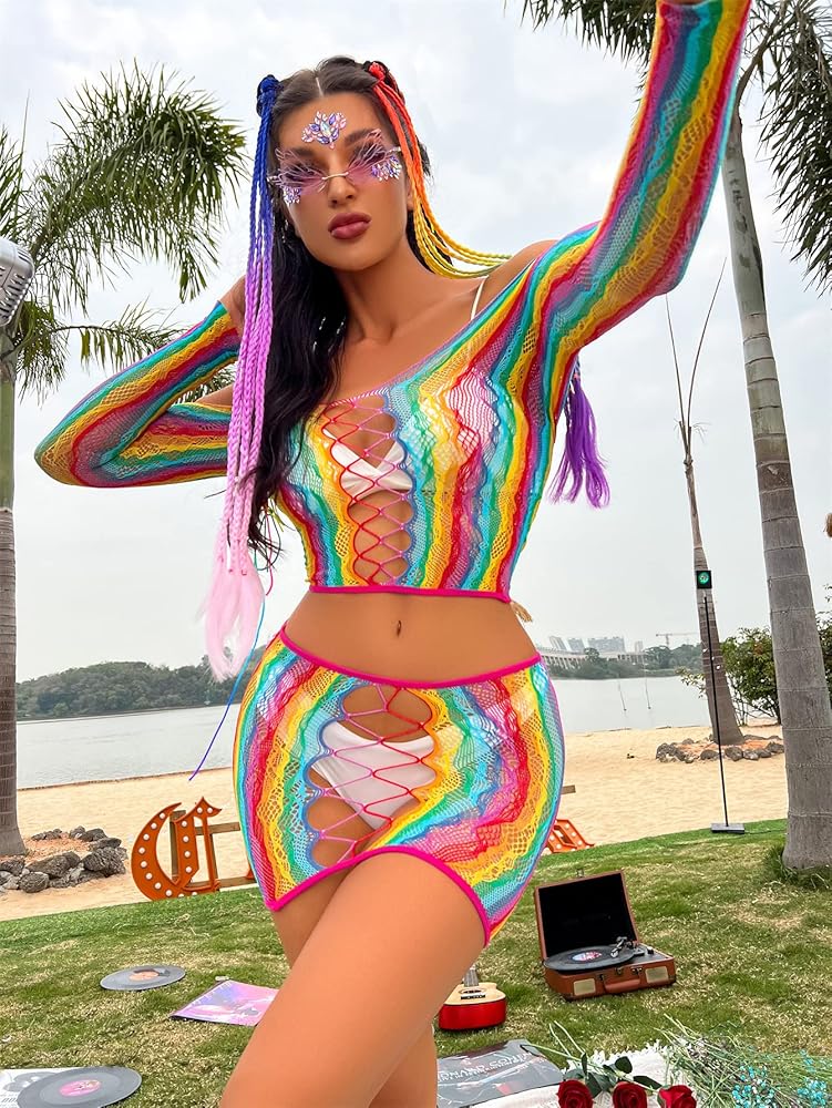 ZGMYC Women Rave Rainbow See Through Mesh Bikini Cover Ups Sexy Hollow Out 2 Piece Crop Top Mini Skirt Festival Outfit Clubwear