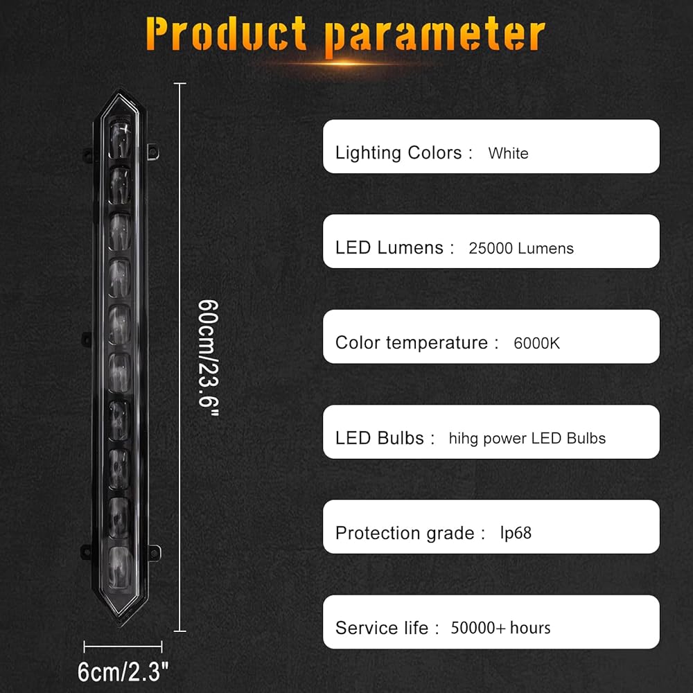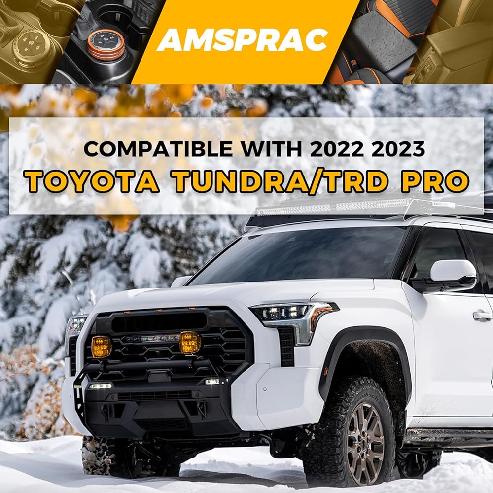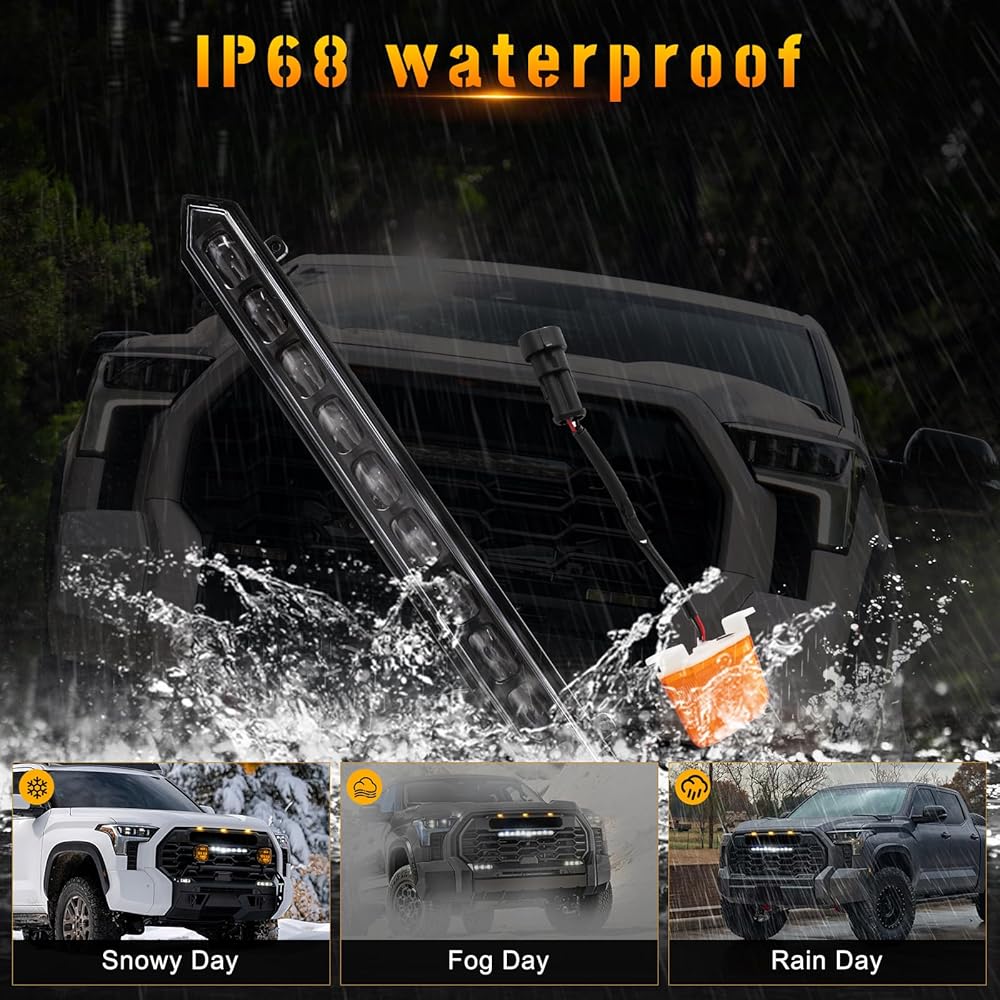 Front Bumper LED Grille Lights:The surface of this 3-Piece center led grill lights for 2024 toyota tundra are made of high quality ABS plastic material,that is with stable performance;highly waterproof;scratches-resistance;easy-cleaning etc. This grille lights are with amber/yellow lighting. Decrate your car to be sporty.