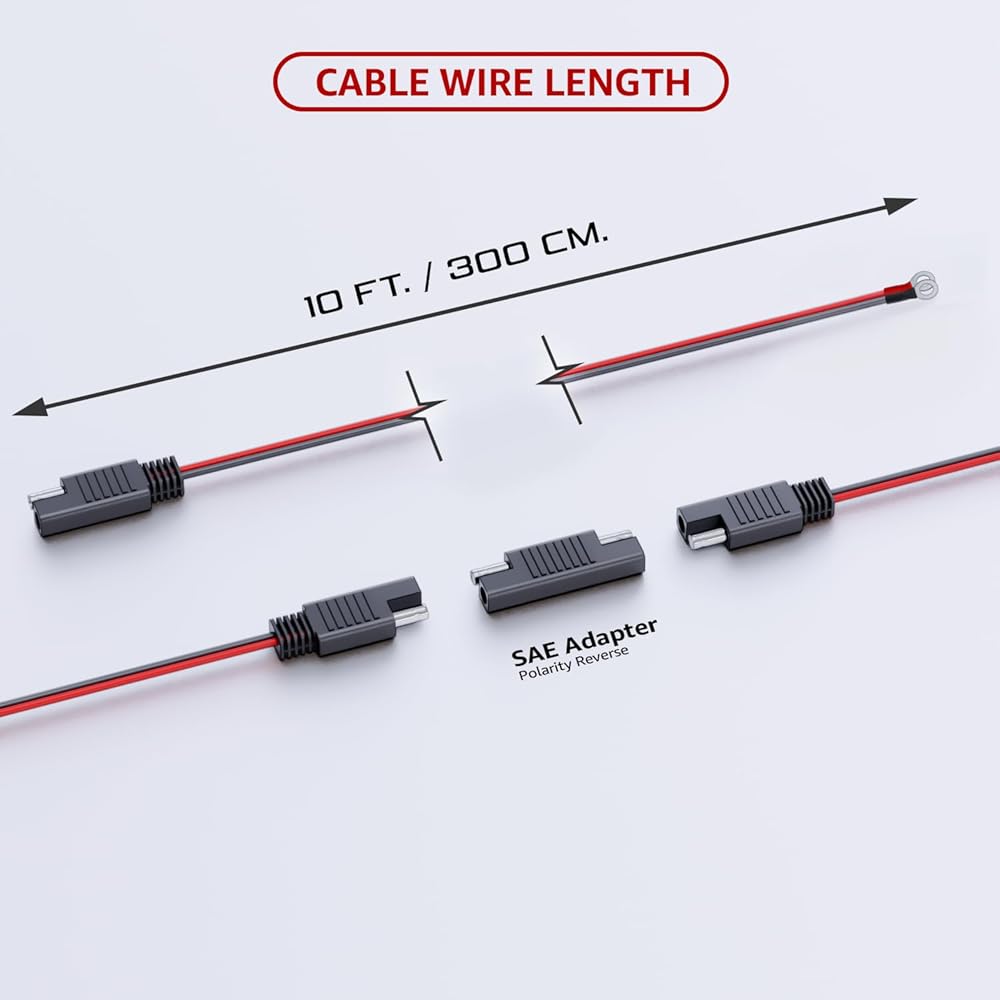 PACK INCLUDED: 1 pack of 12 AWG cables, 10 Feet/300 cm. in length. This is the best way to keep a battery charged on a Car, Motorcycle, Tractor, Riding Mower, every vehicle outdoor equipment.