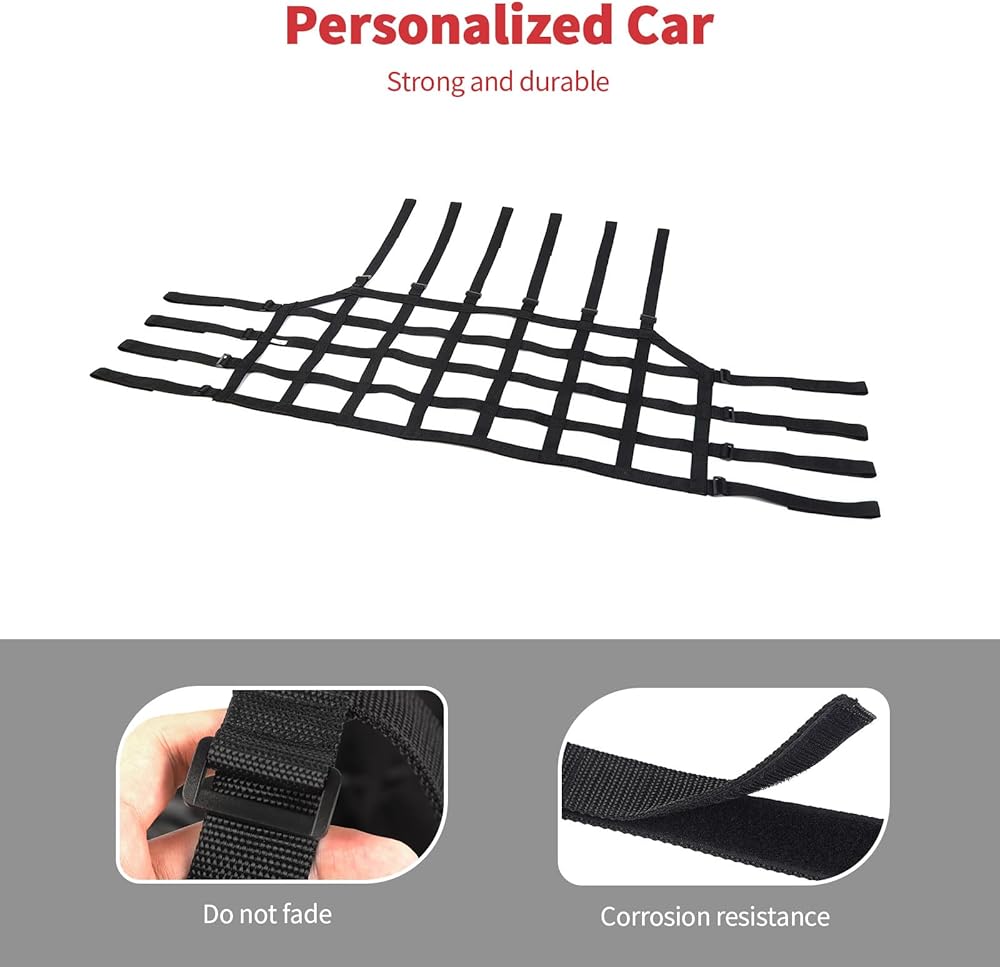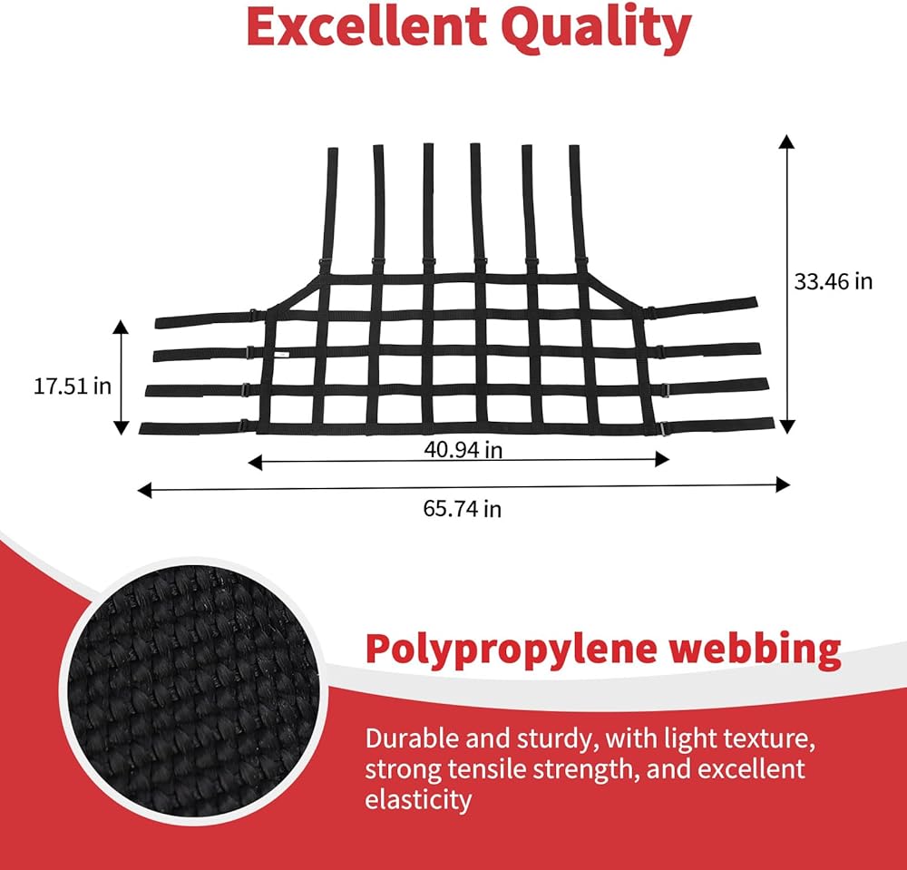 - 🚘Quality Materials: Polypropylene webbing material, Roll-Up Design, metal buckles secure the cargo net to the body pillars.