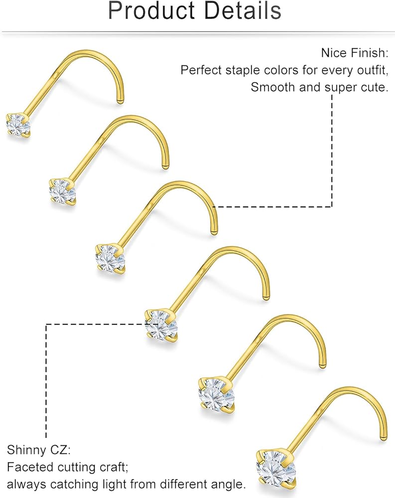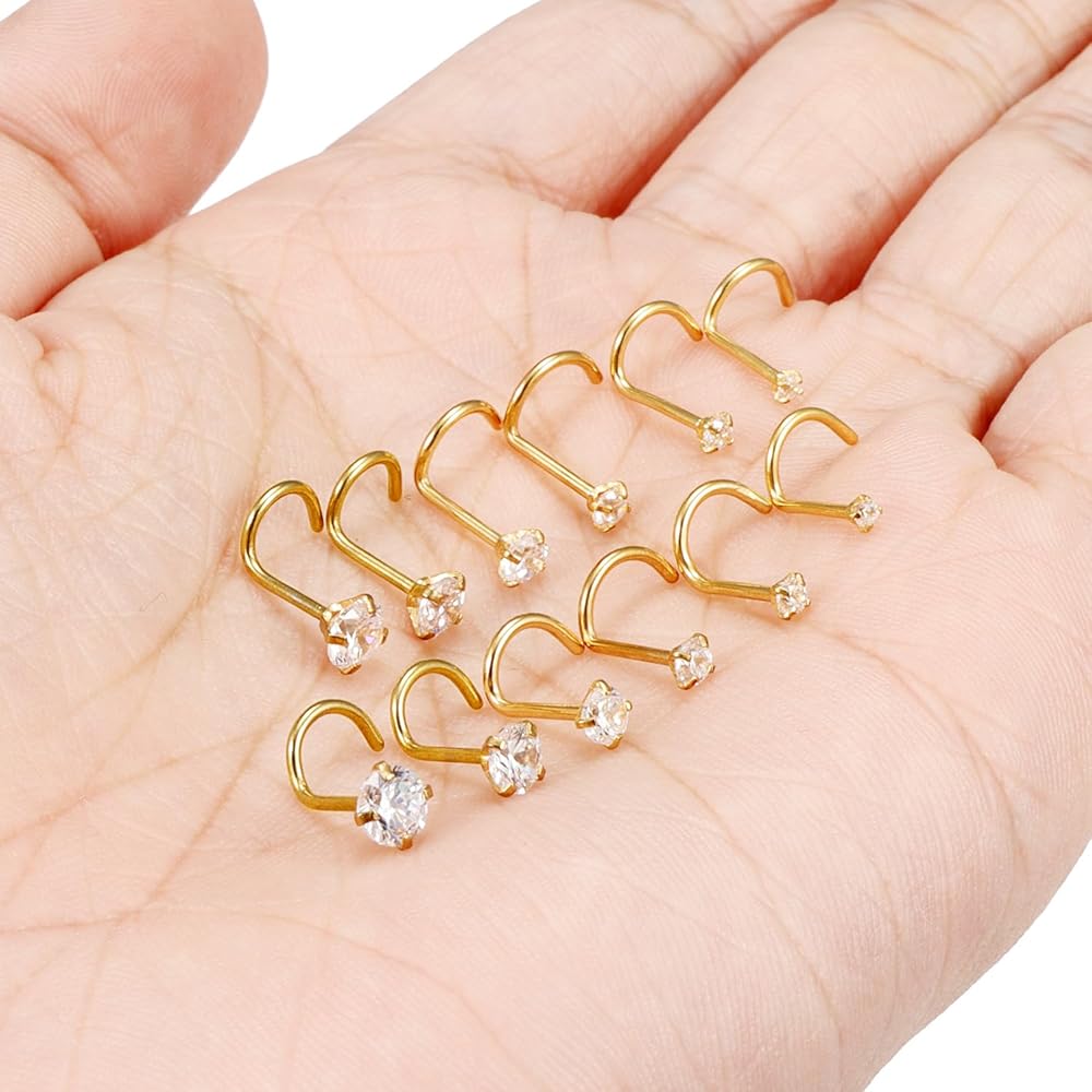 12PCS 22G 14k Gold Plated Nose Stud :It Comes in 6 Different Cubic Zirconia Sizes, Different Stones for Different Experiences, It is CZ Very Shiny,Give You Mutiply Wearring Outfit, Reasonable Price for Body Jewelry, Deserve to Purchase.