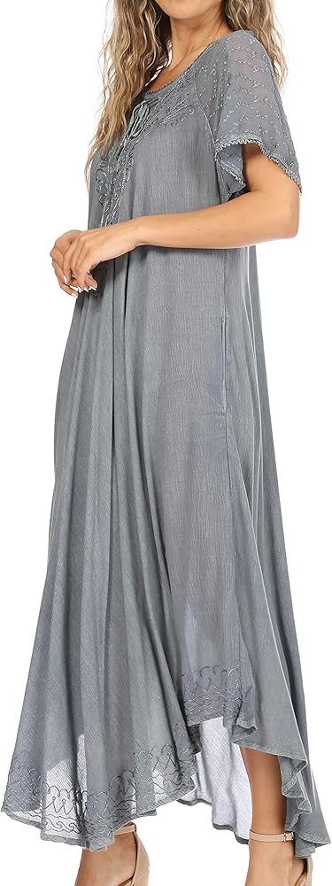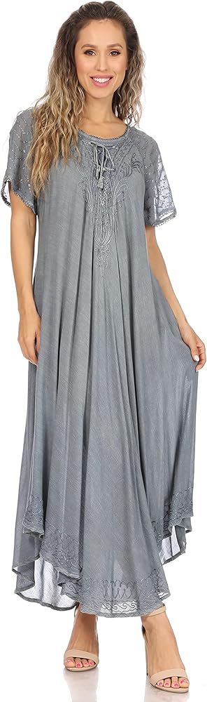 This beautiful cap sleeve caftan dress features lace embroidered cap sleeves that are semi sheer with detailed embroidery along the neckline, and bottom hem. The bottom hem is a curved hem, and there is lace embroidery along the edge hems of the sleeves. There is also an adjustable corset style neck enclosure that can be tied or left undone as desired. This dress comes in our beautiful stonewash shades. This caftan is very lightweight so it is ideal for warmer weather! Just throw on and go! It is also a great dress for cooler weather because all you've got to do is pair with leggings or tights and your favorite coat and shoes and you're good to go! For summer weather, you can wear over swimwear as a modern coverup. So comfortable, you'll want to get one in every color. Hand wash separately in cold water. Line dry. Imported. | Material: 100% Rayon.