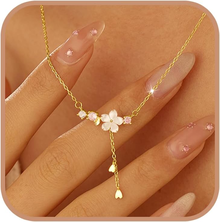 FUNYCHEN 14K Gold Plated Cherry Blossom Necklace for Women daughter Cute Birth Month Enamel Flower Pendant Necklace Pink Floral Artificial Stone Pearl Chain Jewelry Birthday Gifts for Wife Mom