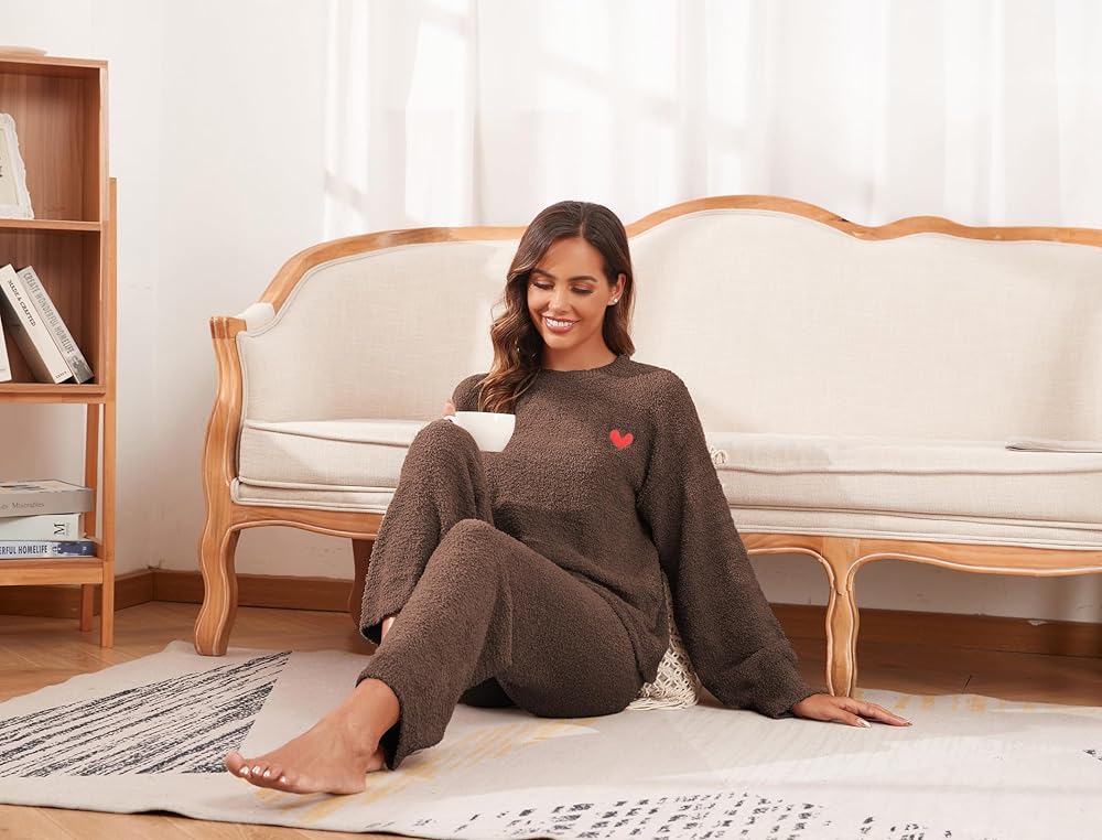 2 Piece Sets: Package contains 1 long sleeve pullover tops & 1 long lounge pants. The plush pajamas is has a super soft hand feel like wearing a warm blanket. Classic and stylish fuzzy pajama set for women creats a cozy and relaxed look.