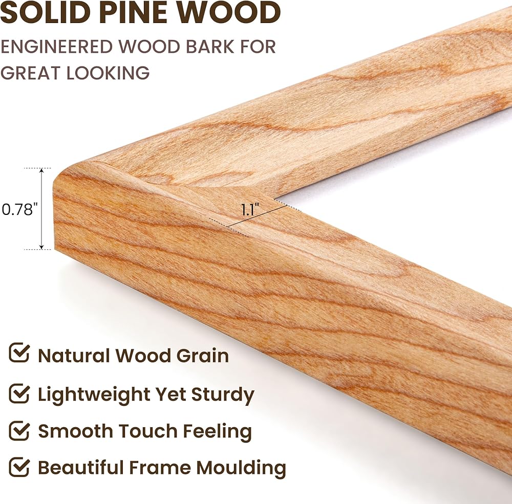 UNIQUE RUSTIC STYLE: The 22x28 Picture Frame's strip is 1.1 inch wide and 0.78 inch thick with beautiful, smooth curves. The engineered bark has a beautiful, solidistic grain and is available in natural, ebony, cherry wood and walnut for your choice. The wooden picture frame itself is very artistic and can meet the framing needs of all kinds of styles of photos, artwork, diploma and posters.