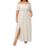 Feature: Off the shoulder, two side pockets, smocked waist, high split (not too high), boho maxi dress
