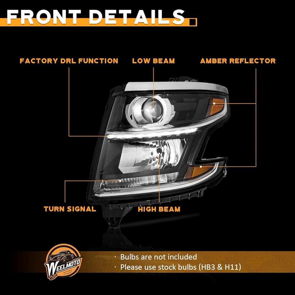 𝐑𝐞𝐯𝐨𝐥𝐮𝐭𝐢𝐨𝐧𝐚𝐫𝐲 𝐥𝐢𝐠𝐡𝐭𝐢𝐧𝐠 𝐞𝐱𝐩𝐞𝐫𝐢𝐞𝐧𝐜𝐞: WEELMOTO's design team uses professional equipment to create an expert light pattern for super-bright headlights that meets the SAE standard (Society of Automotive Engineers). Compatible with: 2015 Chevrolet suburban headlights assembly / 2017 chevrolet suburban headlights / 2018 chevy suburban 3500HD headlights / 2019 tahoe headlights / 2020 suburban headlight