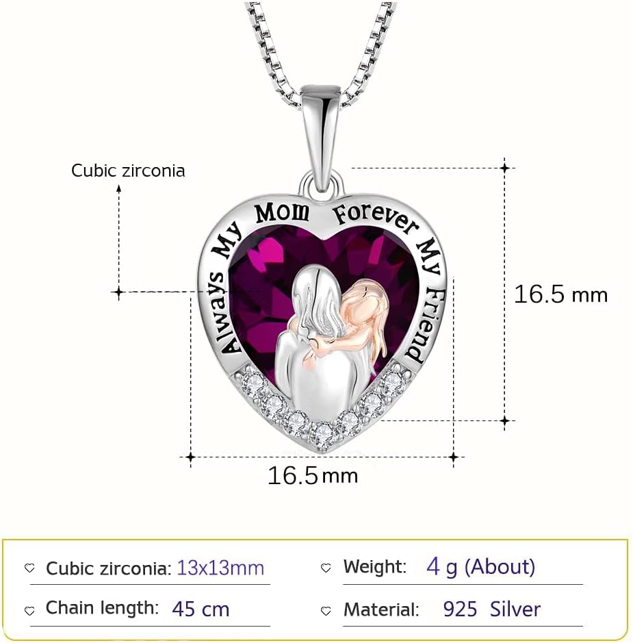 Mother Necklace Christmas Birthstone Pendant 925 Sterling Silver Heart 5A Cubic Zirconia Always My Mother Forever My Friend for Sister Birthday Women Mother's Day Anniversary
