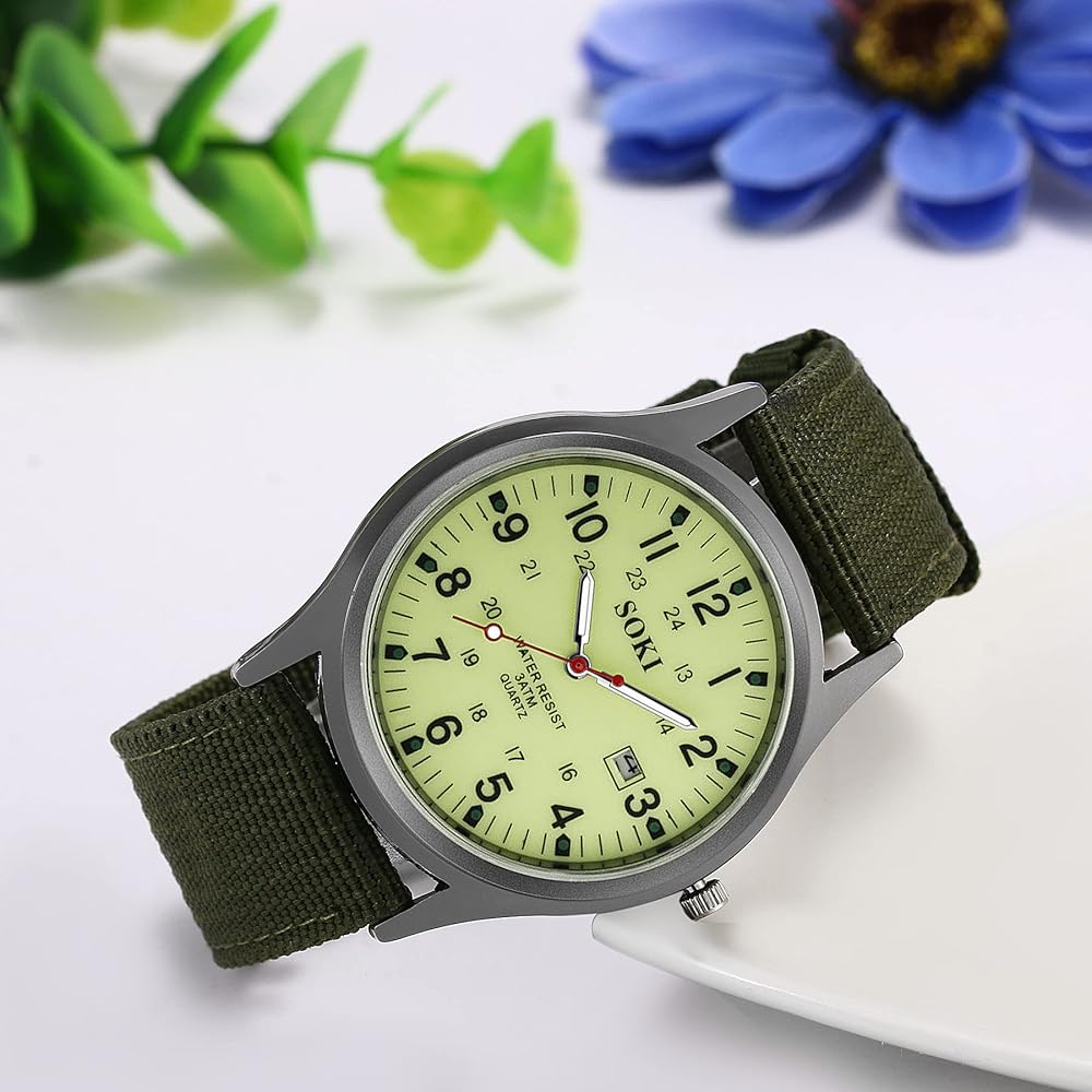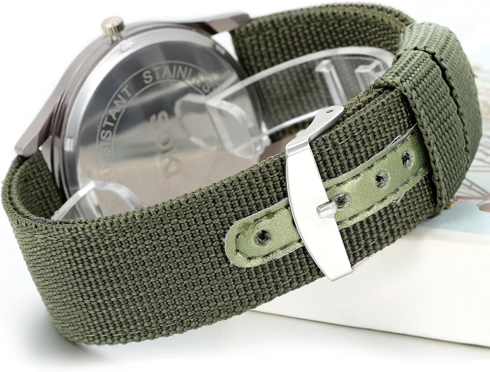 HIGH QUALITY: Soft and breathable nylon strap. Metal buckle for adjusting band size from 14.5cm to 19cm to fit different sizes of wrists. PU leather on a nylon strap is more durable. The metal watch case is durable. Metal back for scratch resistant. Green metal dial is eye-protecting and for clear time display.