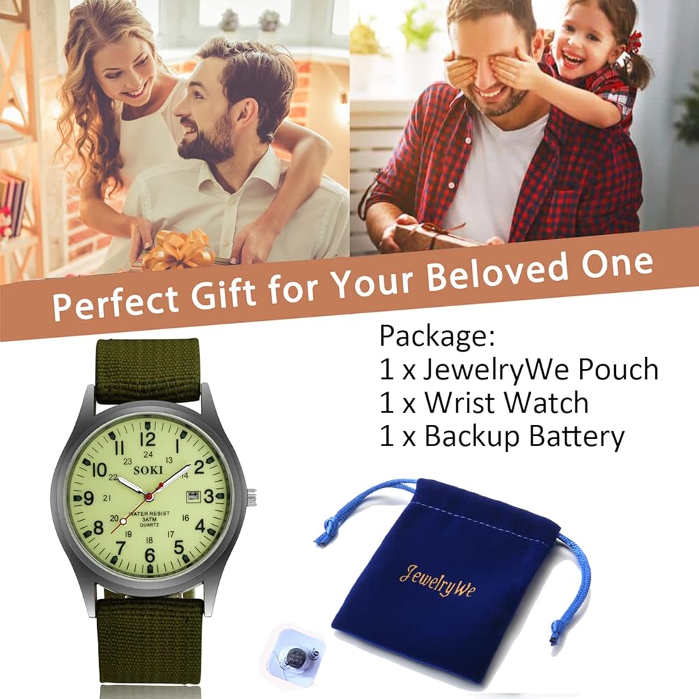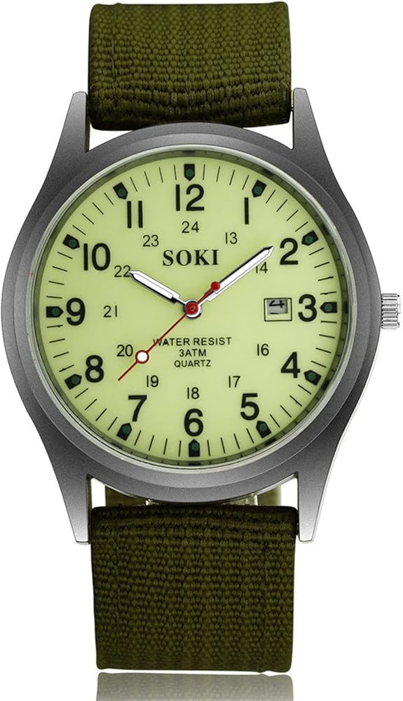 PRECISE TIMING: The Military watch equipped with quartz movement and battery offers precise and accurate time. Tell time your way with this watch using clear dial and distinct hands. Auto Date display. Luminous hands help you see the time at night.