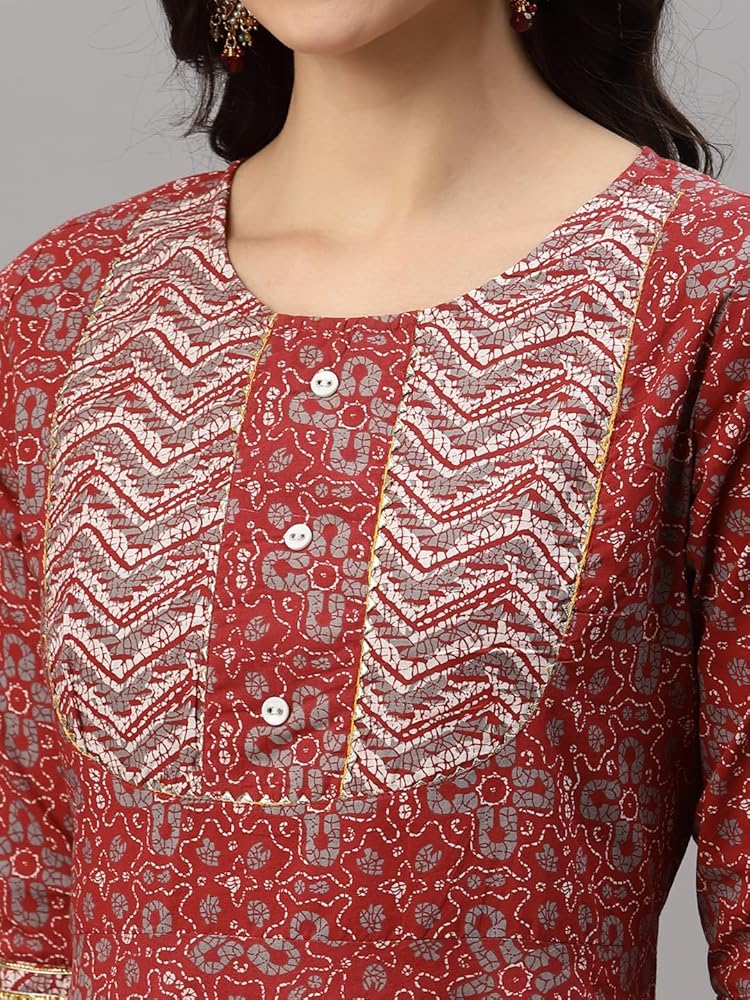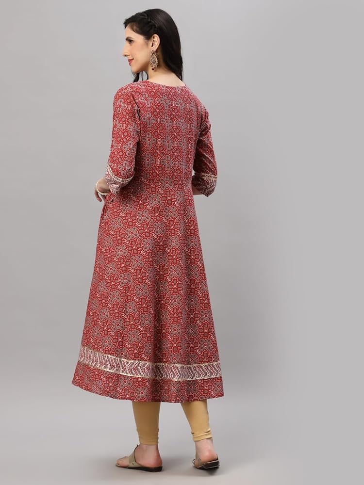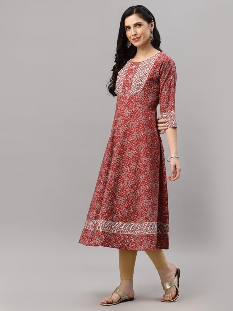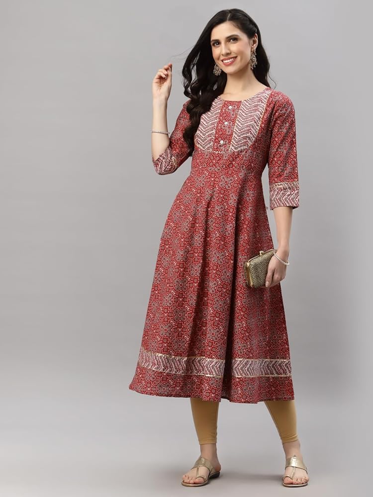 This Floral Printed Anarkali Kurta by Yash Gallery has crafted in Cotton fabric and features Three-Quarter Sleeves and a Round. The yoke is embellished with Gota Lace. You can wear this Kurti as casual wear or you can carry a dupatta with this. This Kurti is easily wearable in the office. This is Anarkali Kurta in the style which gives you a gorgeous look. This Kurti is available in all sizes from XS to 5XL. You can customize the size of the Kurti according to your measurement. It can be paired with trendy jewelry like jhumkas and choker accessories. The product Length is 48.
