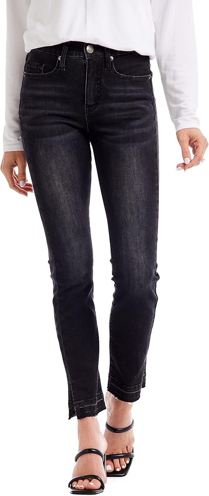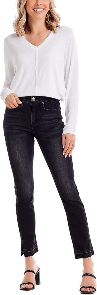 These Nico Black Release Hem Jeans features Fall newest design. The stretch denim jeans feature a high-waist. The jeans have a zipper-fly. The jeans have a Mud Pie button closure. The jeans have front and back pockets. The jeans have a straight leg release fray hem. The inseam measures approximately 28" on size small. The jeans are made of 72% Cotton 24% Polyester 2% Spandex 2% Other fiber. The jeans can be washed inside out. The jeans can be machine washed on cold.