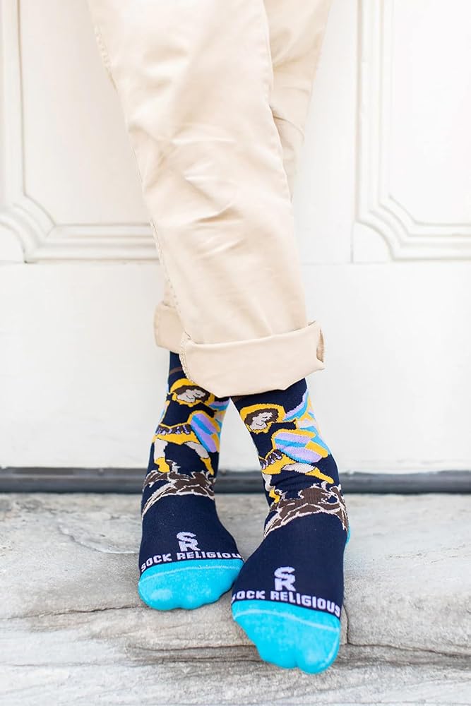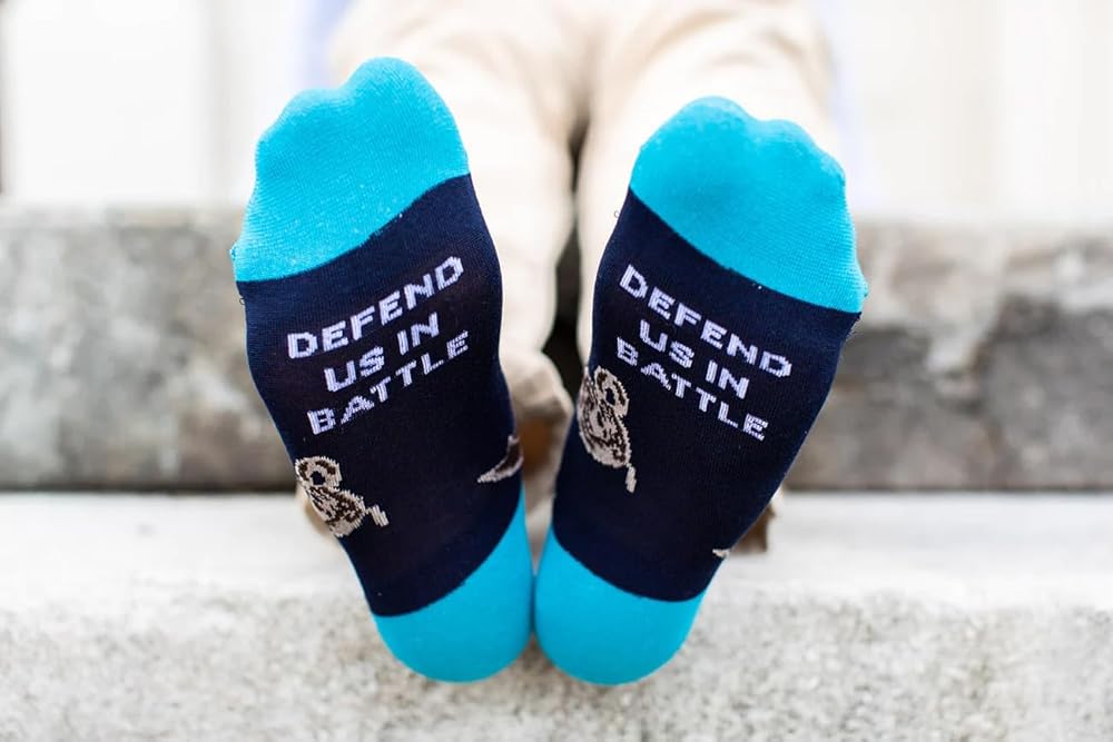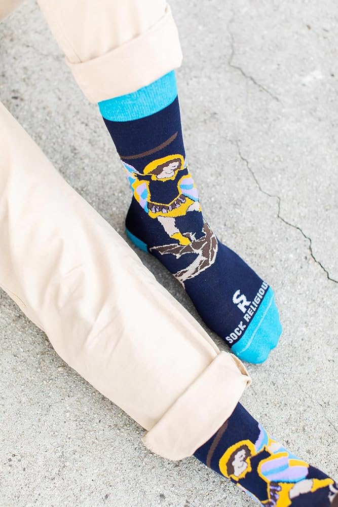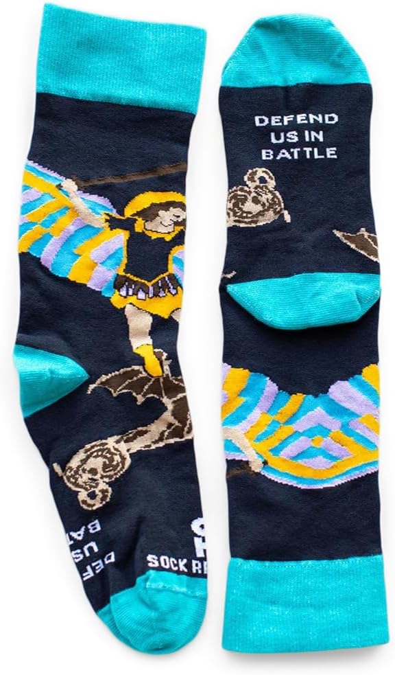 St. Michael the Archangel socks will remind you of St. Michael's protection as you go into the battle of your daily life; Sentiment on the bottom reads "Defend Us In Battle"; The leader of all angels and the army of God, his name means "one who is like God" and he provides fierce intercession and protection
