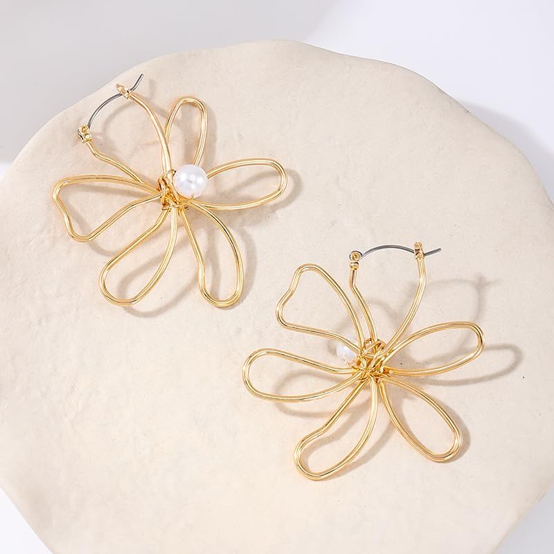 Large Gold Flower Earrings for Women Gold Pearl Flower Earrings Silver Openwork Large Flower Stud Earrings Delicate Line Flower Earrings for Women Jewelry