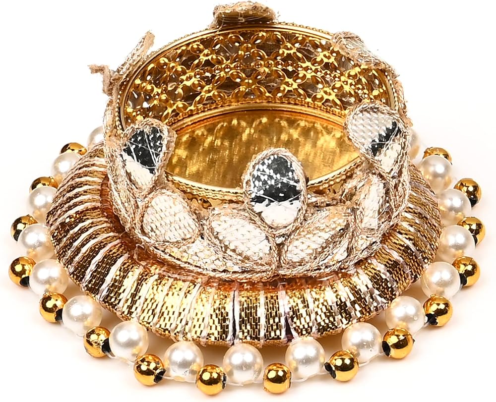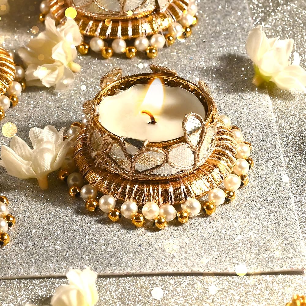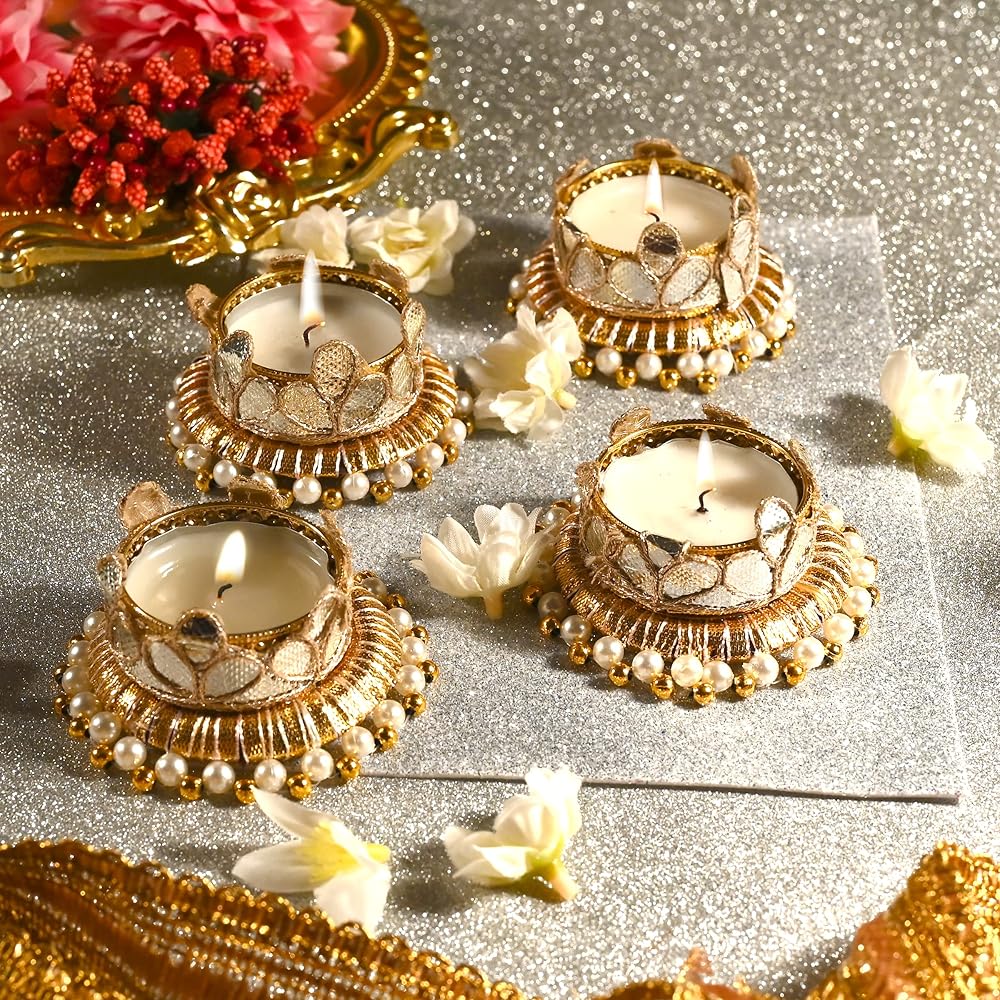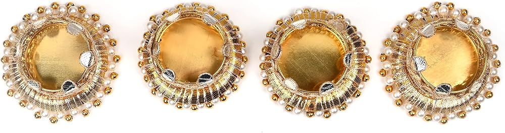 Set of 4 Jute Ring with Moti Beads T Light Candle Stand Tealight Holder Lights Festival Indian Traditional New year Decorations Lighting Accessories Wedding Home Decor(Without Wax)(Size:-4")(Golden)