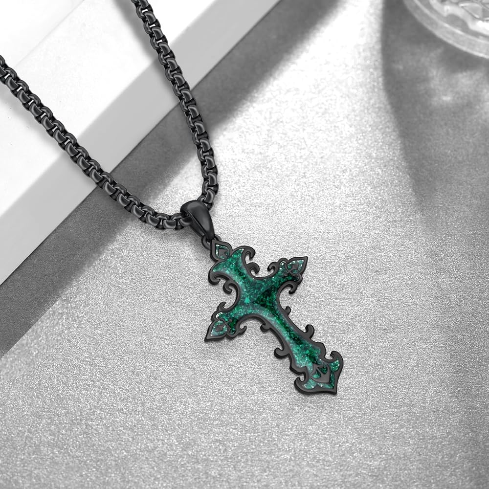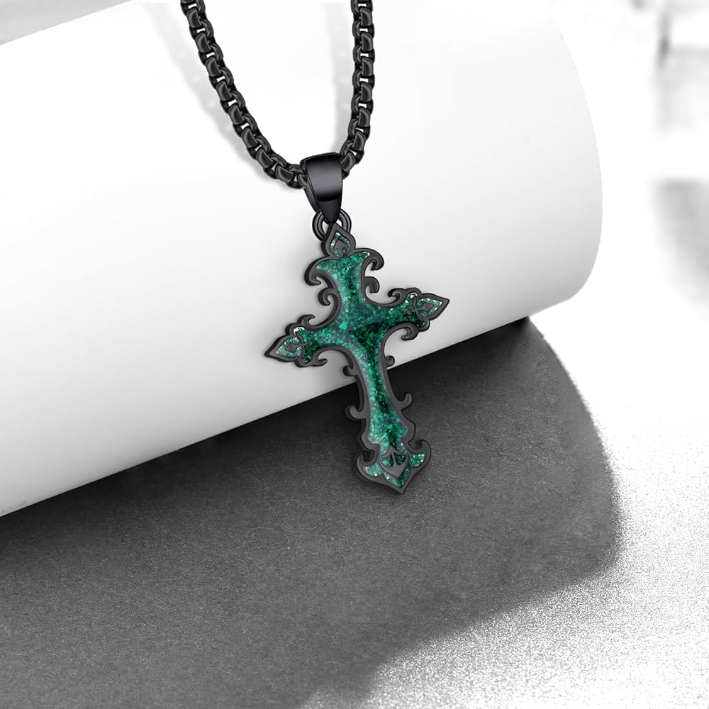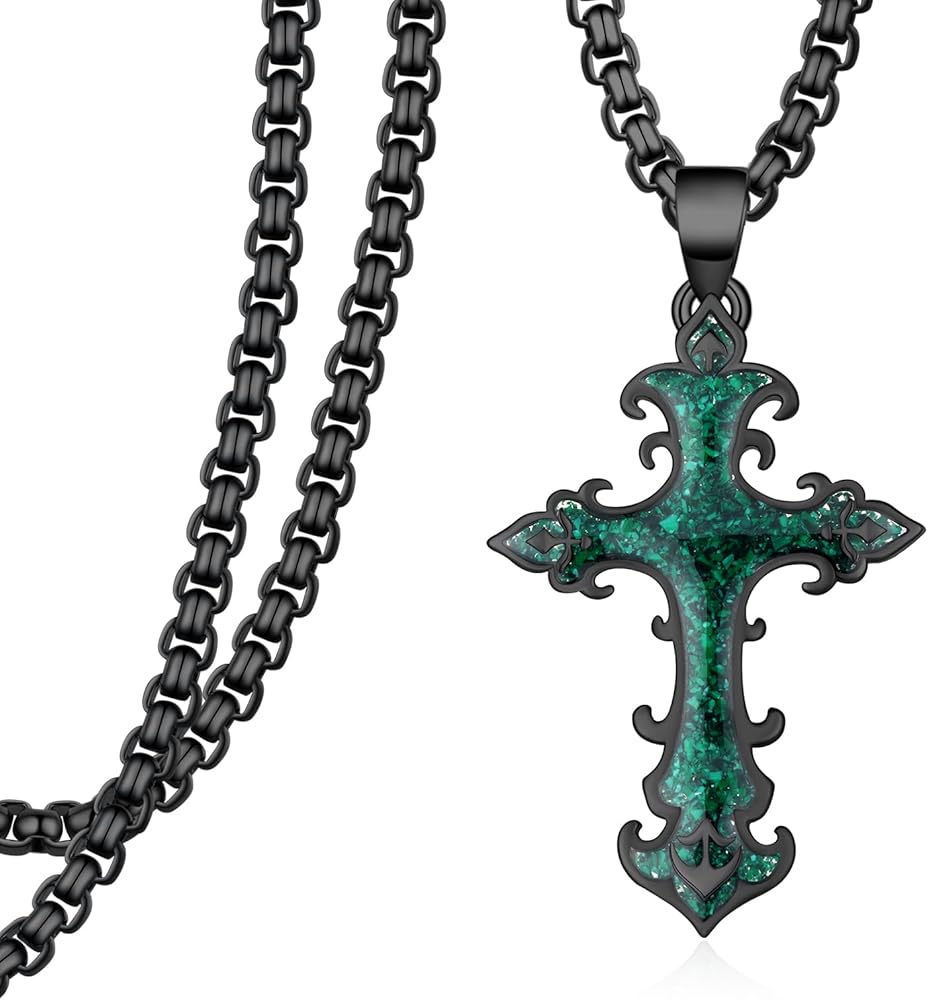 Cross Necklace Size: 39*22 mm(1.53*0.87 inch), adjustable stainless steel chain: 22+2". A black cross inlaid with turquoise gravel represents good luck and protection.