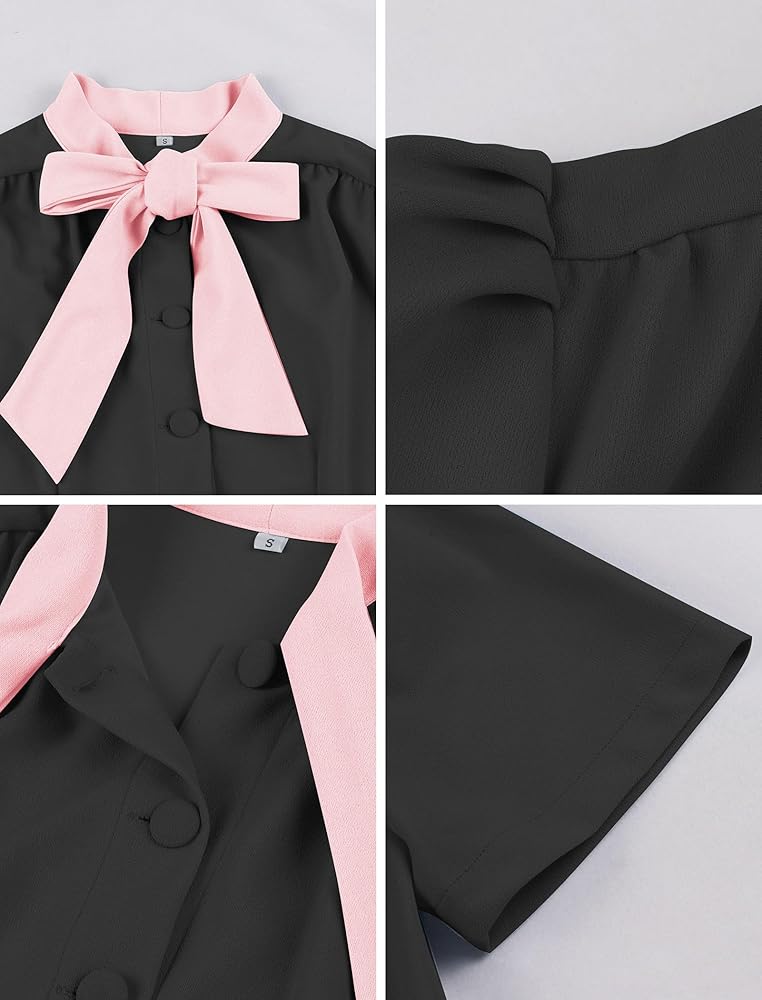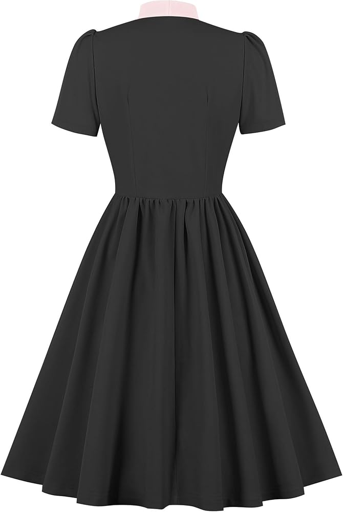 Design: Audrey Hepburn style rockabilly swing dress with solid color design, elegant and beautiful, gives you a retro 50s pin up look. Short sleeve and stand collar can emphasize your beauty and elegance. A self-tied bowknot at neckline looks so exquisite and pretty. Features ruffled detail to make you more graceful and beautiful. Collect waist is designed to accentuate your feminine silhouette and enhance your overall charm.