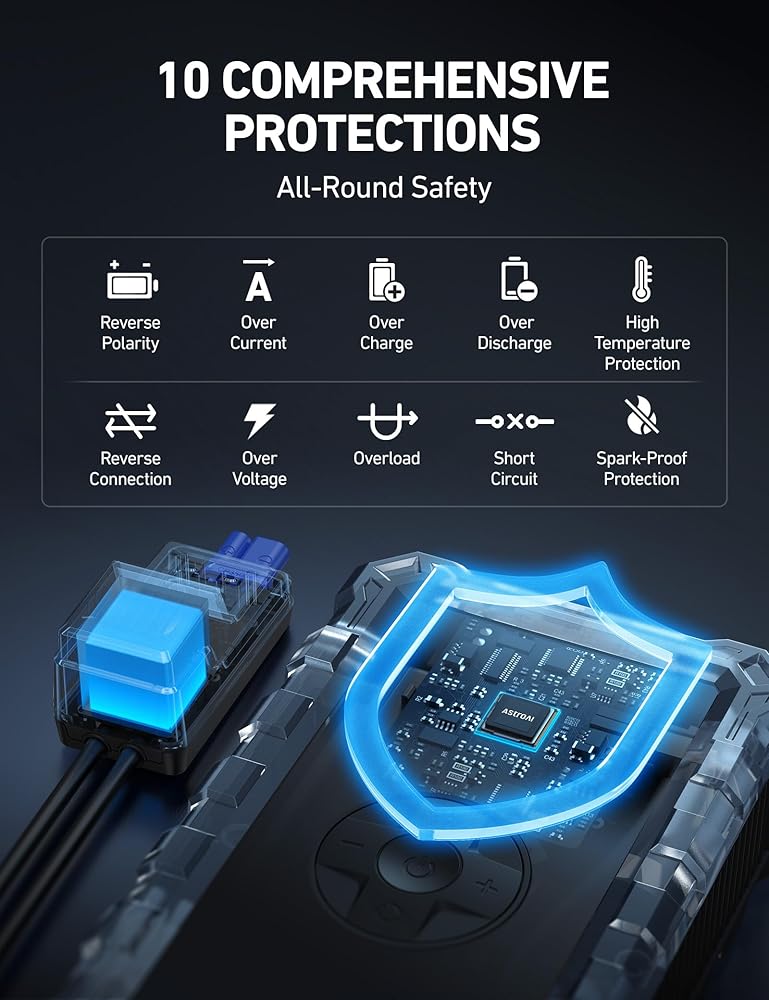 ENHANCED SAFETY & QUALITY: The AstroAI S8 Air Jump Starter has 10 built-in 10 protection features that prevent misoperation from occurring, meeting national standard UL & FCC Certifications. Its durable ABS housing is tough enough to withstand accidental drops. Our customer's safety and comfortability using this product is our top priority