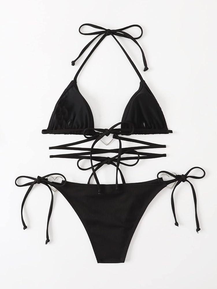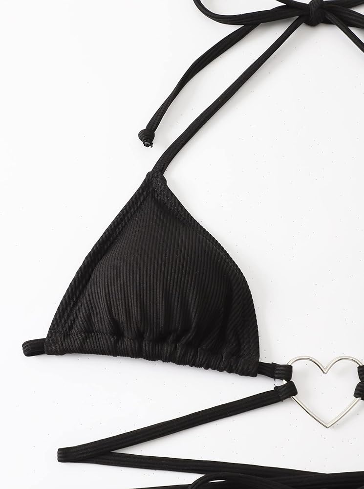- Feature: 2 Piece Set, Heart Ring Linked, Lace Up, Tie, Halter, Ribbed Knit