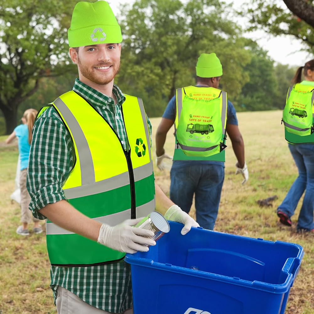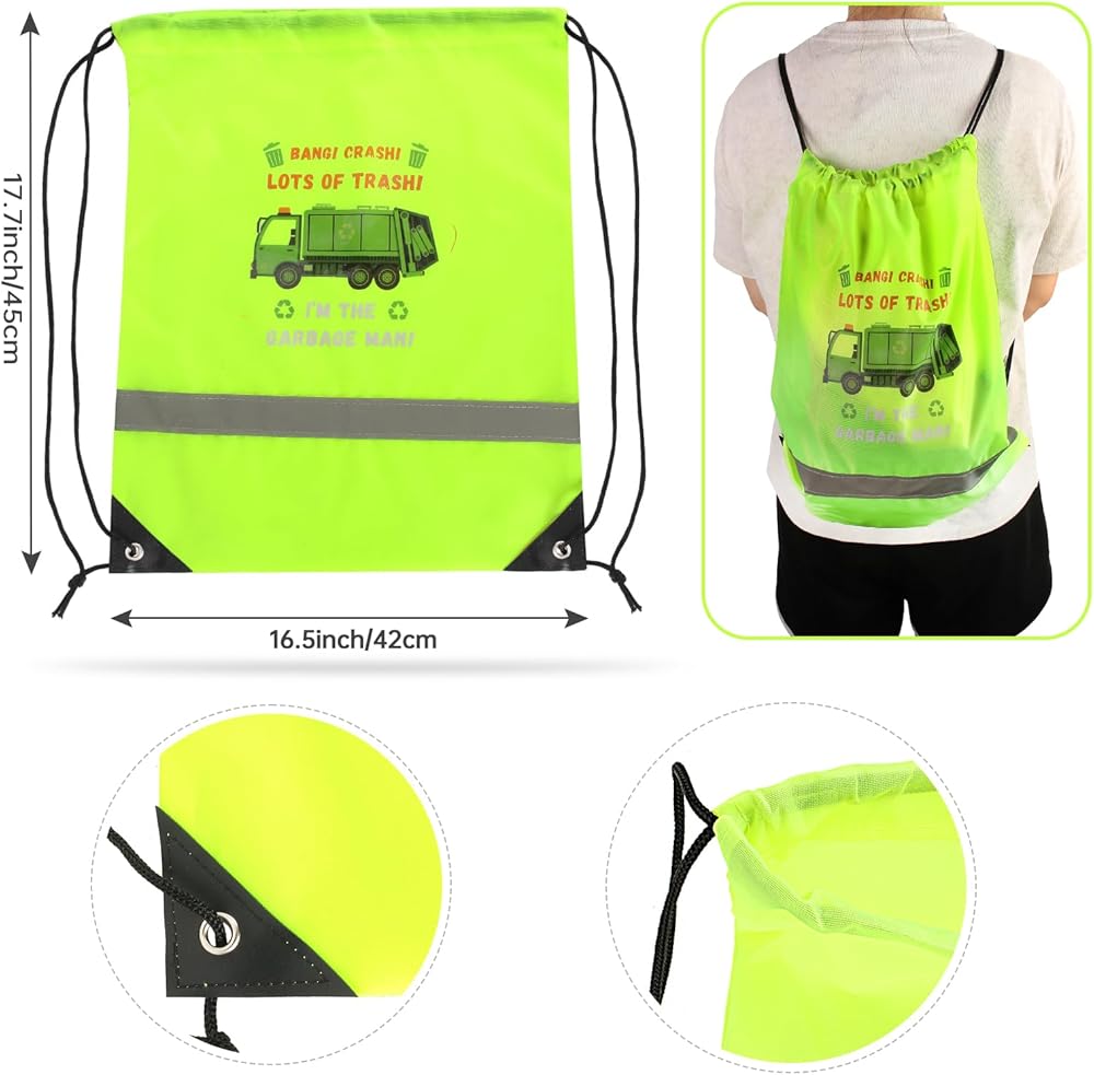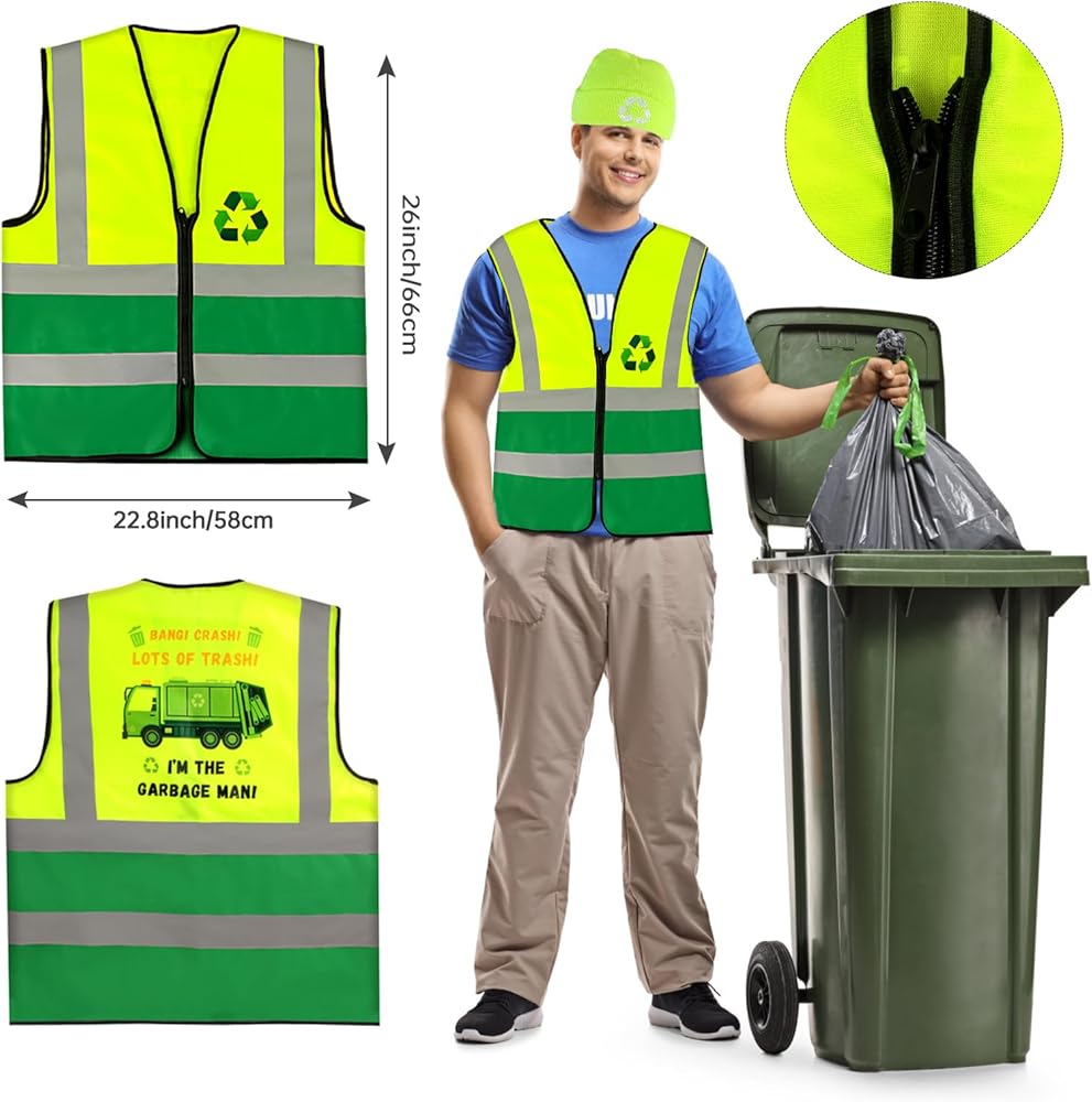 Bring the hardworking spirit of a sanitation worker to life with this fun and realistic adult garbage man costume set. Perfect for Halloween or themed events, the set includes a vibrant safety vest, beanie, gloves, and a drawstring backpack with fun patterns.