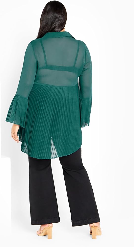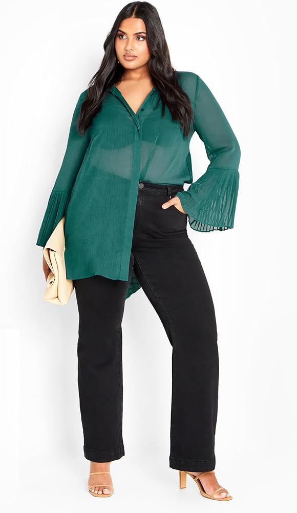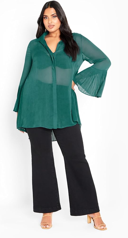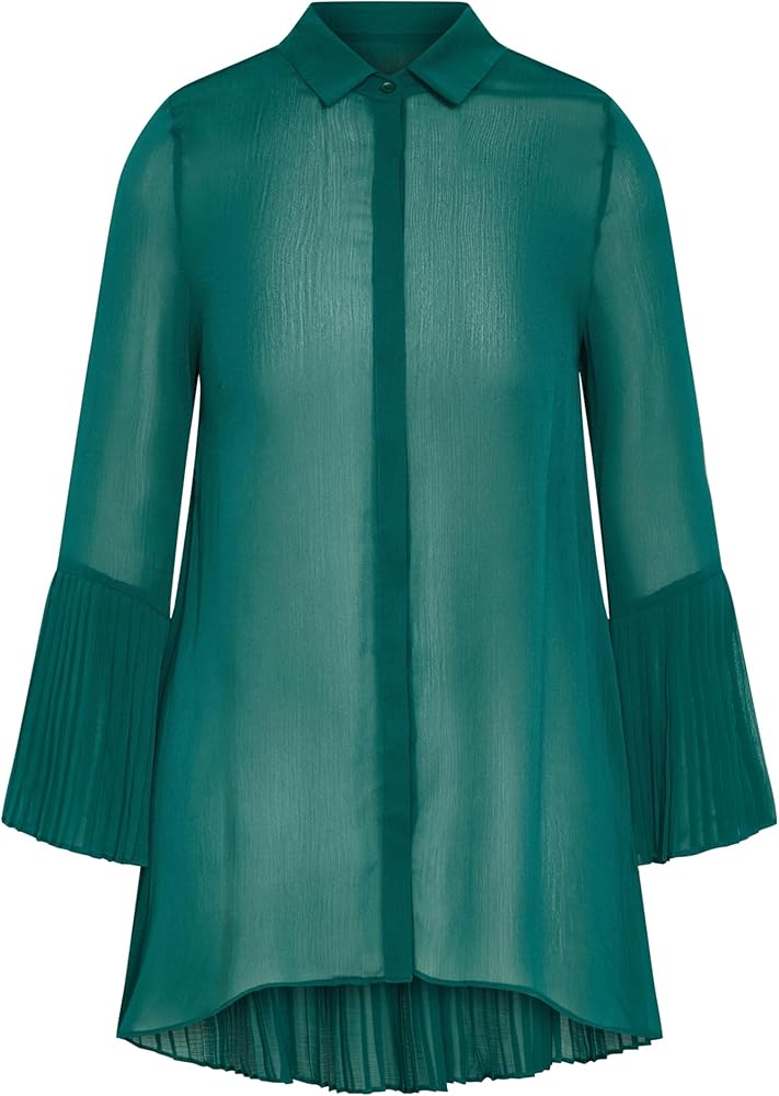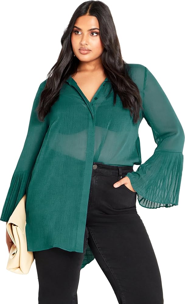 Turn up the chic with the Perla Pleat Shirt – bringing you a collared neckline, statement bell sleeves with playful pleats, and an easy-breezy button-down front. Keep it relaxed with the fit, embrace the semi-sheer sophistication, and let the hi-lo hemline with pleated back touches set your style apart. Key Features Include: - Collared neckline - Full length bell sleeves with pleated detailing - Darted bust - Button down front - Relaxed fit - Semi-sheer fabrication - Hi-lo below hip length hemline with pleated back details - Unlined