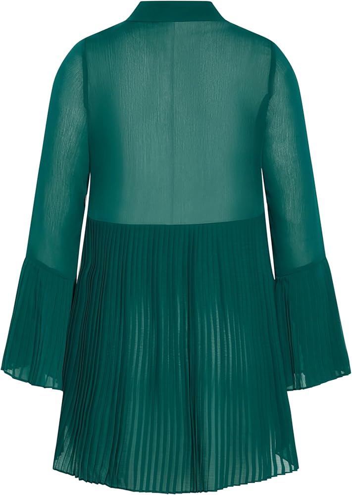 Key Features Include: - Collared neckline - Full length bell sleeves with pleated detailing - Darted bust - Button down front - Relaxed fit - Semi-sheer fabrication - Hi-lo below hip length hemline with pleated back details - Unlined