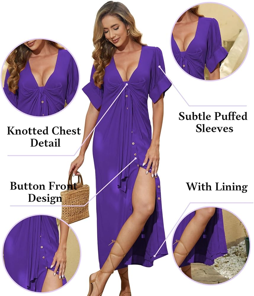 【DESIGN & MATCH】The featured sexy wrap v neck, with lining, knotted chest detail, split front, button down design and subtle puffed sleeves shows your unique beauty. This vintage maxi dress can not only be paired with high heels or sandals in summer, you can also pair it with jackets, cardigans and boots in the fall and spring.