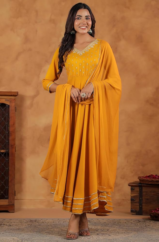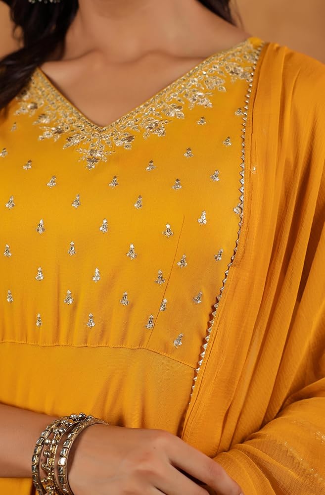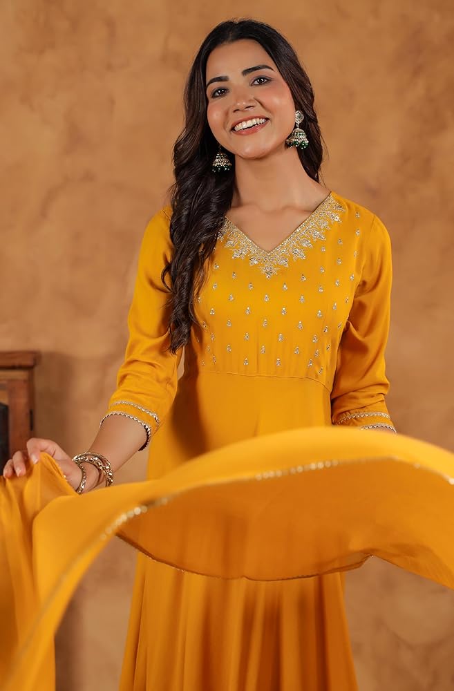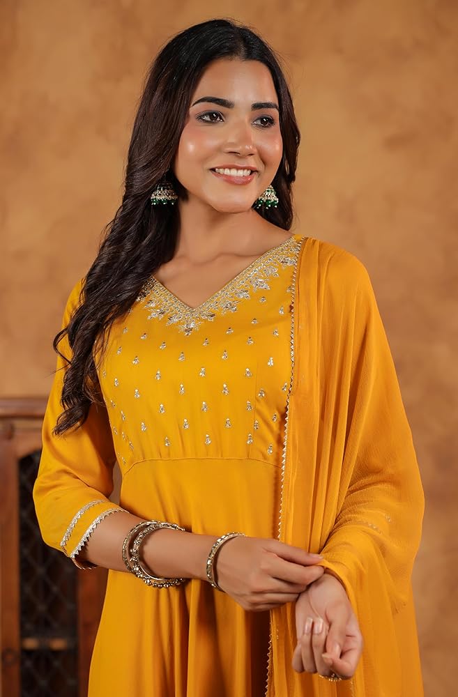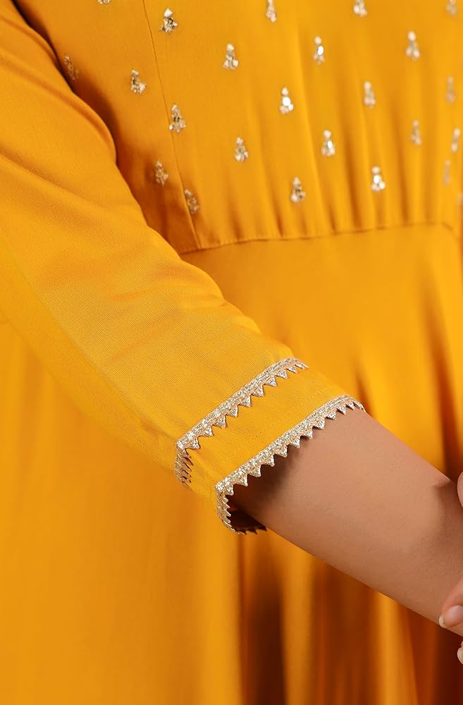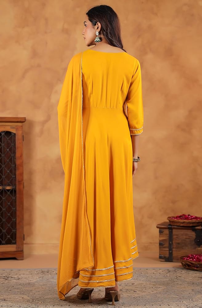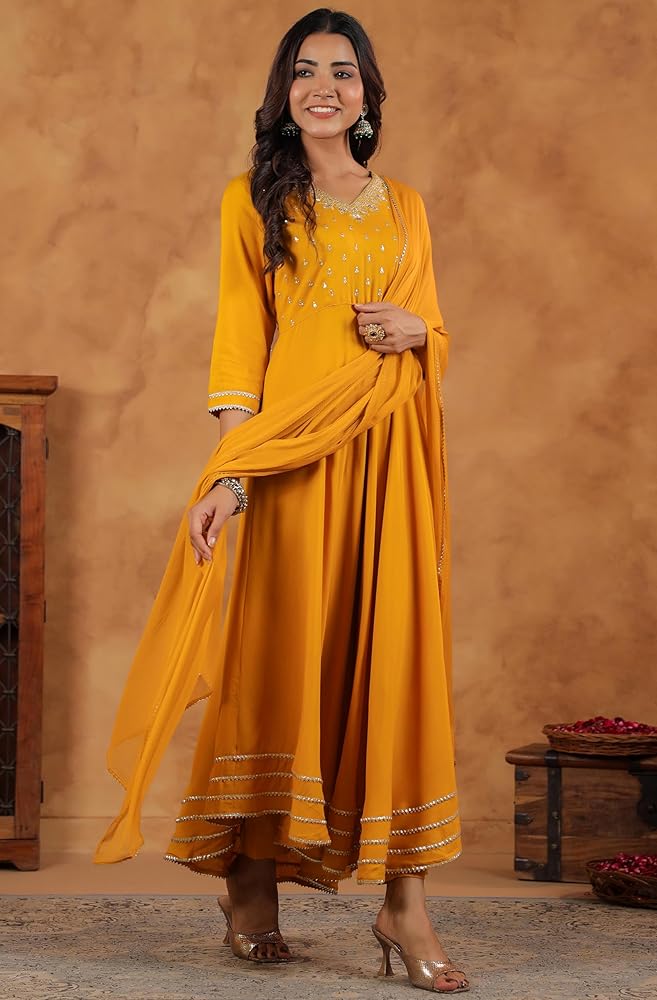 Make a statement with Janasya's black rayon zari embroidered Anarkali Kurta set, featuring intricate Zari work on the yoke for a touch of regal elegance. The V-neckline adds sophistication, while lace inserts at the bottom enhance the fit-and-flare silhouette, giving it a graceful and flowing look. Paired with matching narrow pants and a coordinating dupatta, this ensemble exudes timeless charm and elegance, perfect for festive occasions or special events.