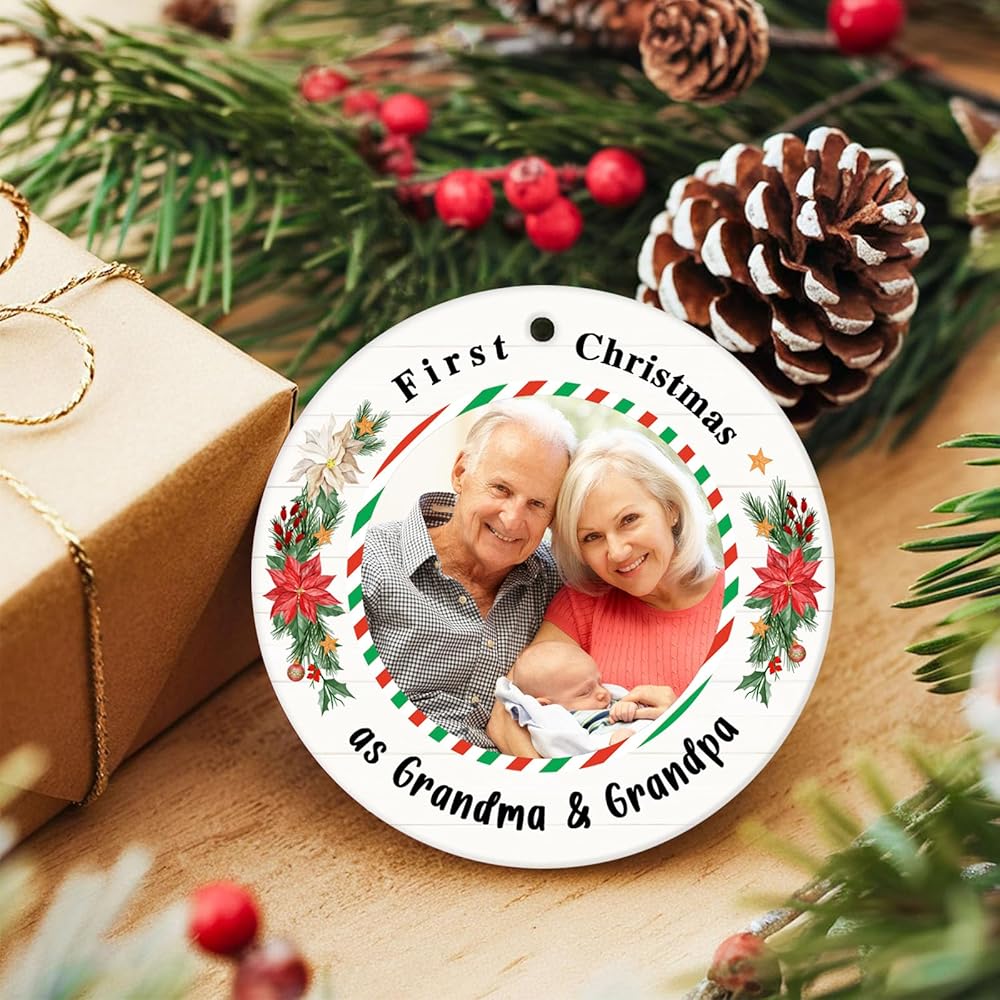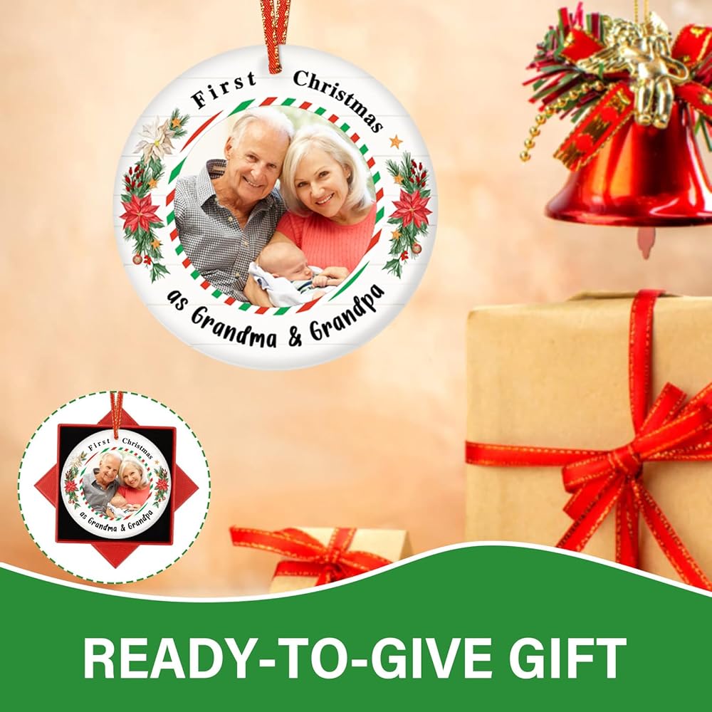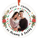 First Christmas as Mommy and Daddy Ornament: Package includes 1 piece new parents photo frame ornament, 1 piece ribbon and 1 gift box. The new parents Christmas ornament measures about 3" in diameter, photo size could be 1.8"x 1.8", suitable for decorating Christmas tree.