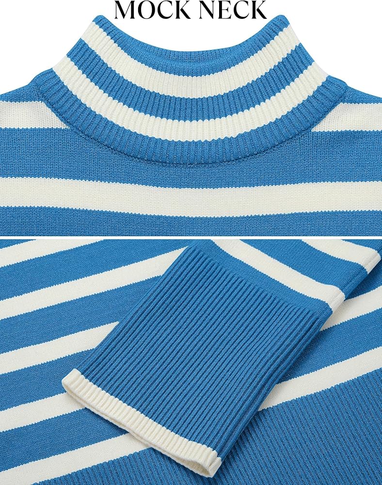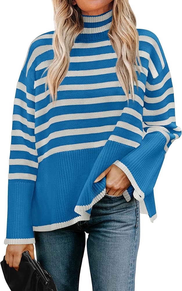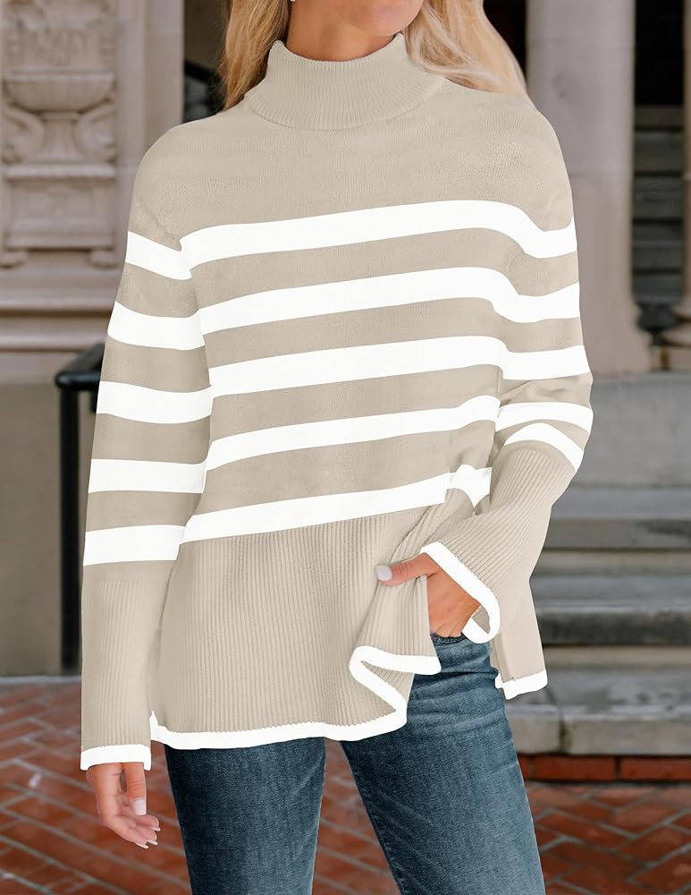 Looking for a warm turtleneck sweater this fall and winter season? Our long sleeve striped sweater is the ideal choice for you, featuring a highneck, flared sleeves, ribbed cuffs/hem, side slit, and a simple yet classic stripe. The relaxed fit is perfect for almost any body type!