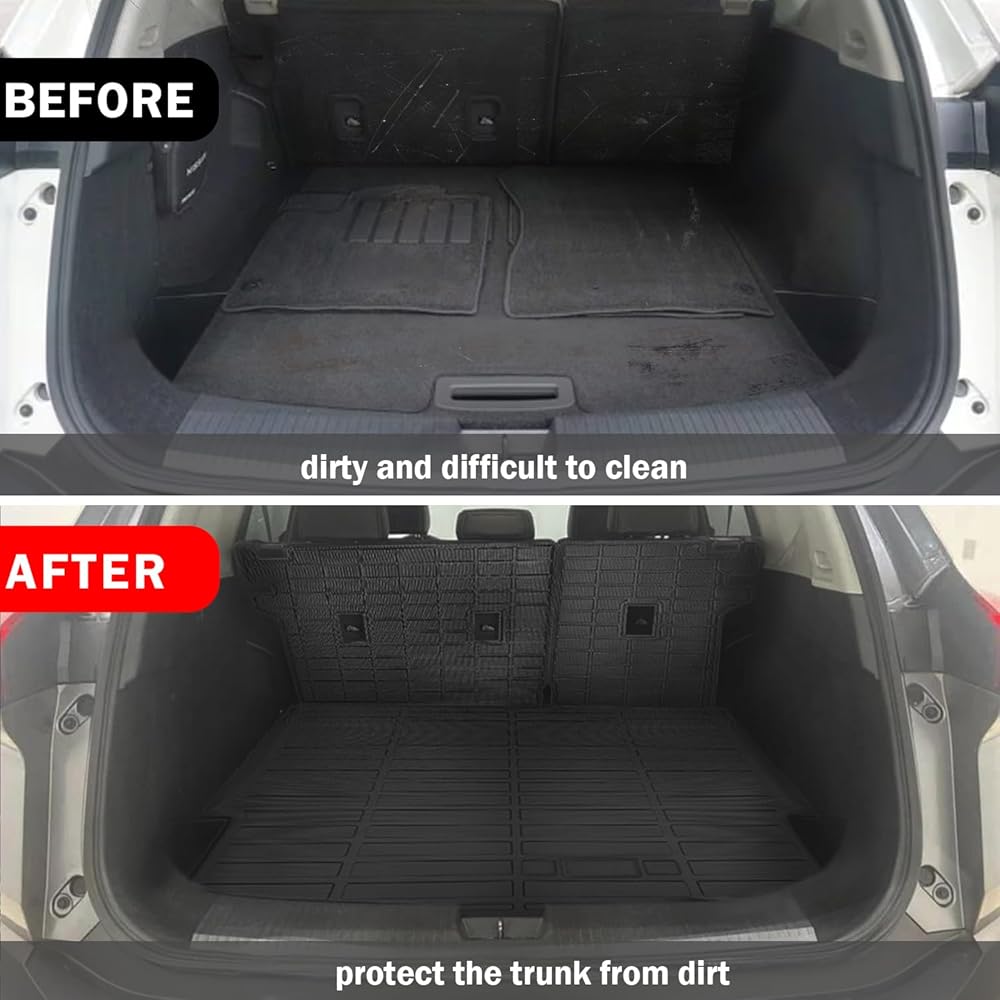 【مادة TPE مطورة】 متوافقة مع سجادات أرضية Nissan Rogue ومسند ظهر المقعد وسجادة الشحن مصنوعة من بطانة البضائع TPE تتميز بمادة عديمة الرائحة وصديقة للبيئة، مما يوفر بيئة آمنة ونظيفة مقاومة للماء والبقع، وتمنع بشكل فعال اختراق السوائل والحفاظ على نظافتها.