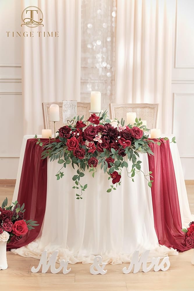 TINGE TIME Artificial Sweetheart Flower Swag with Tablecloth and Table Runner, Pack of 3 Floral Arrangement for Wedding Sweetheart Table Centerpiece Decoration (Burgundy Red)