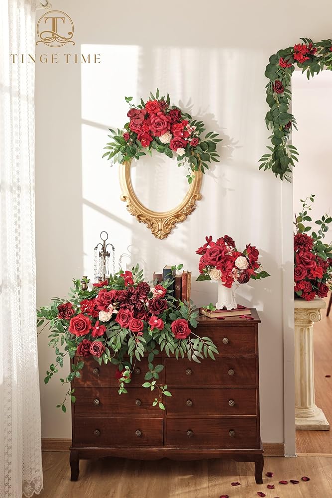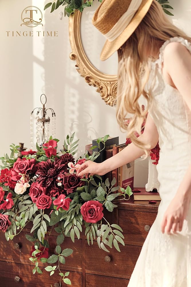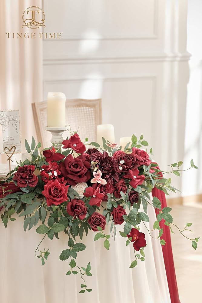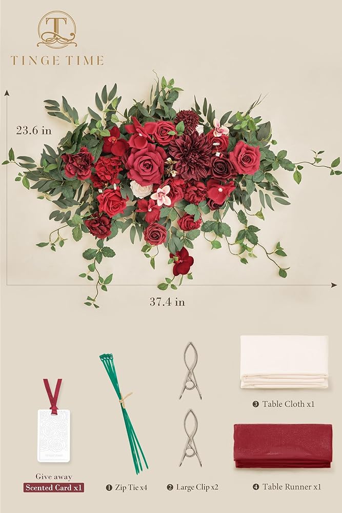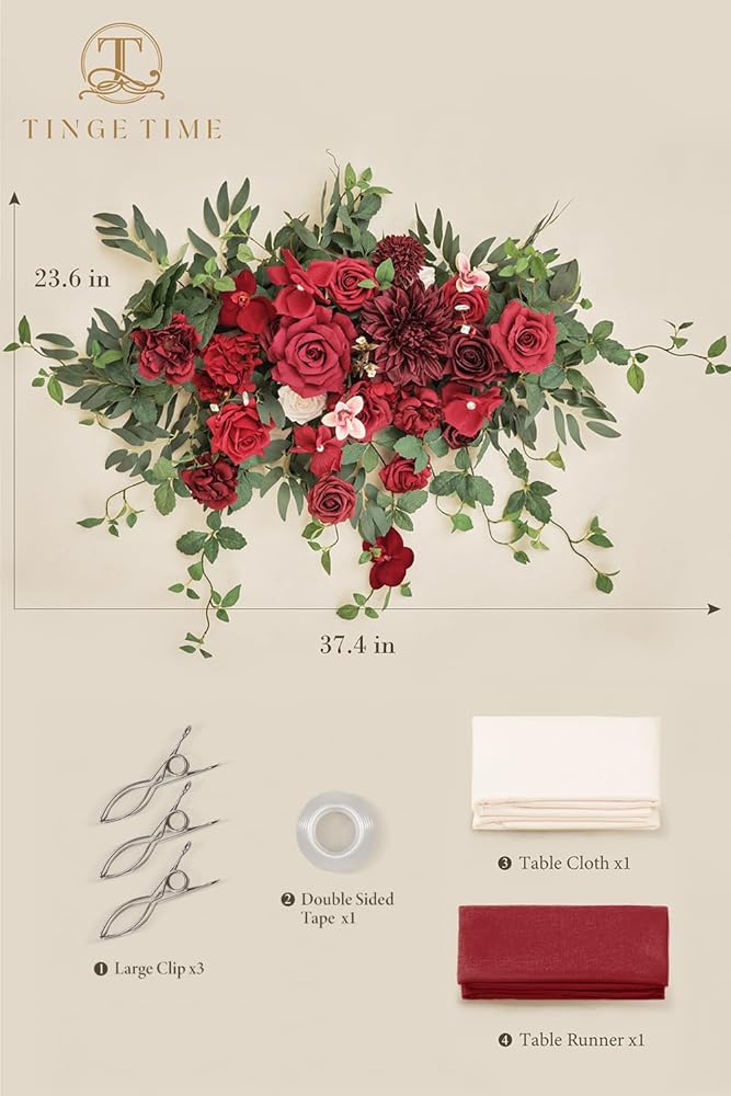 【High-quality Materials】The table floral swag measuring 37.4'' in length by 23.6'' in width, is made of high-quality silk and foam, main flower is burgundy rose, red dahlia, red rose, red ranunculus, red phalaenopsis, red hydrangea, foam red rose, foam champange rose and come with some red jewels.