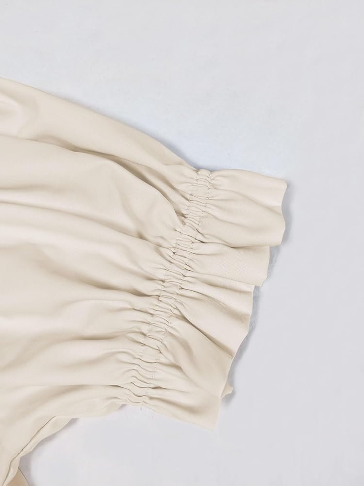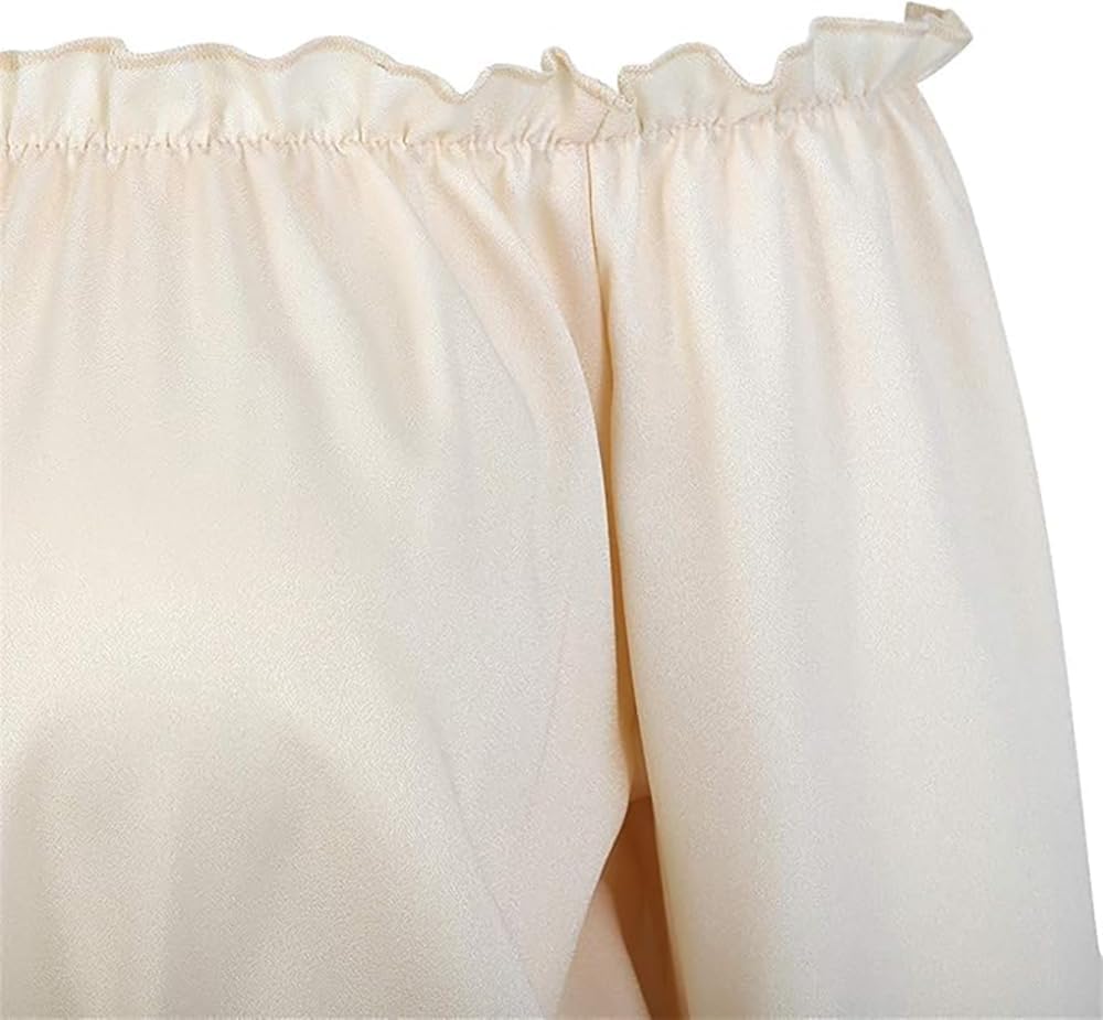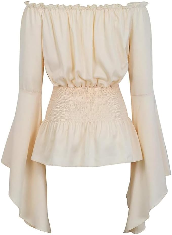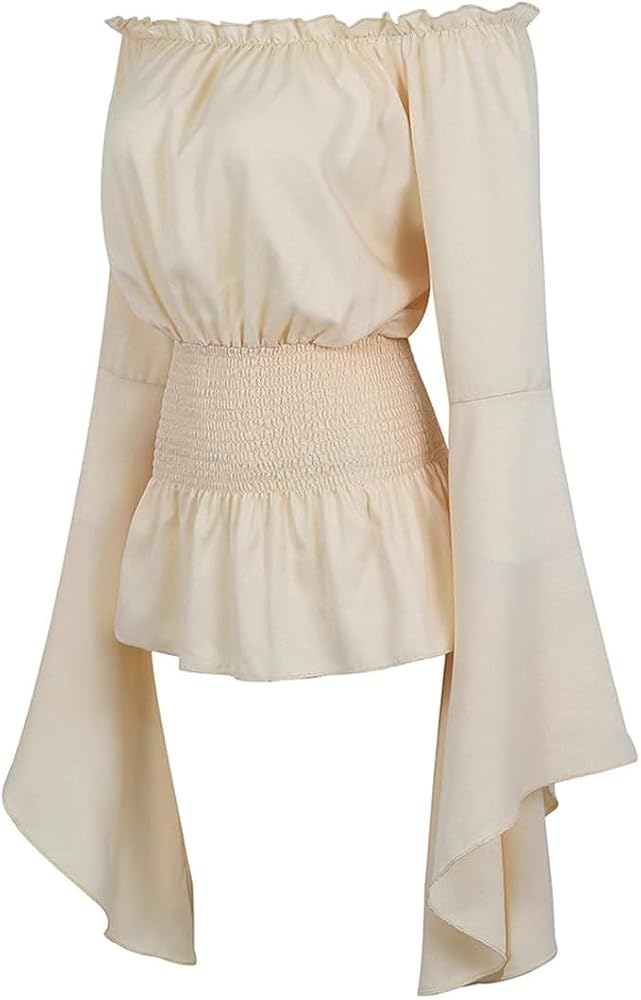FEATURES: women renaissance blouse featured long bell sleeves, off shoulder neckline with elastic band ruffle, smocked waistline. pretty bell sleeve top. The neckline of this renaissance shirt can be worn in two ways, either as off the shoulder top or as a dressy casual top.