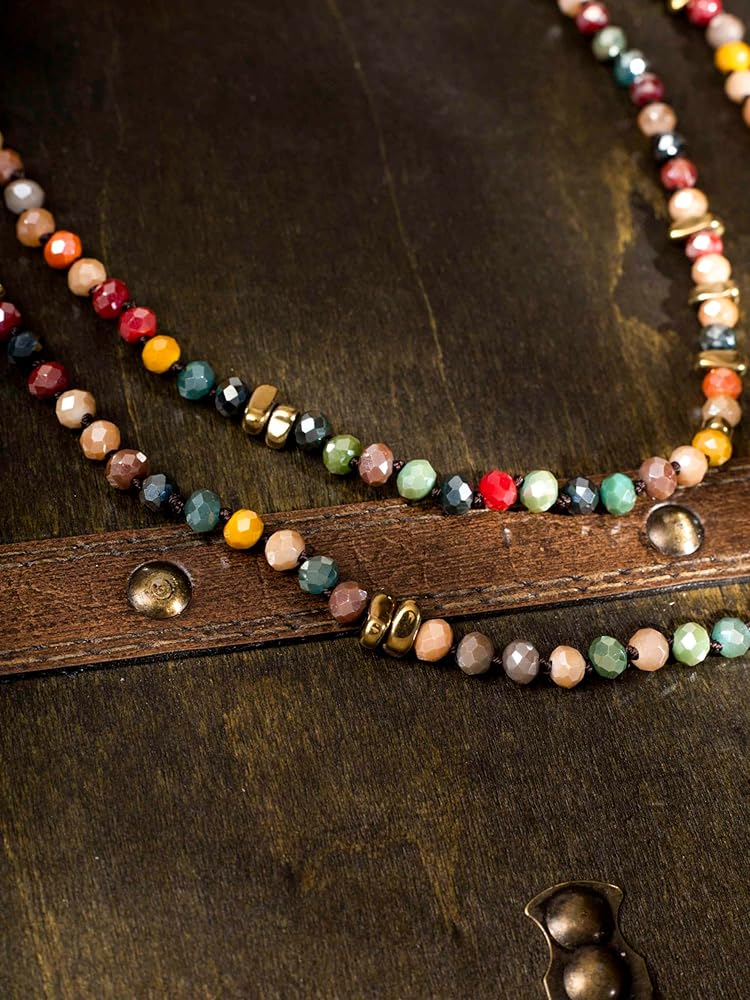 Vibrant Beaded Design: This eye-catching necklace features a colorful array of coated reflective glass beads in a bohemian, vintage-inspired style.