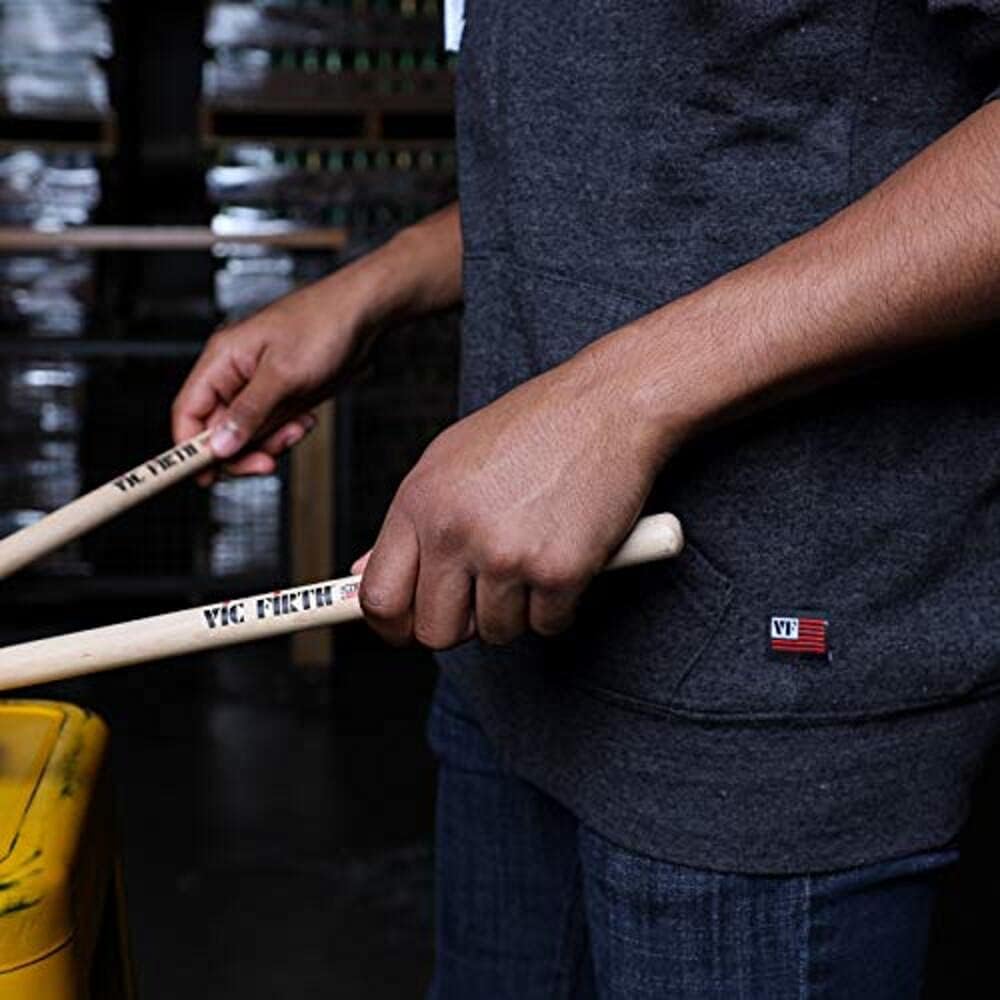 A classic logo hoodie in plush tri-blend fleece, the Vic Firth Gray Zip Up Logo Hoodie is an essential wardrobe addition for the Vic Firth player. This heathered black hoodie has thick drawstrings, side pockets and a woven VF flag tag on the bottom left side. With a vertical Vic Firth logo along the right chest and a subtle VF seal logo on the left chest, this hoodie is as stylish as it is soft. Available in unisex sizes XS through 3XL, this hooded sweatshirt is a perfect fit for every drummer.