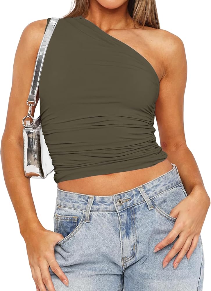 【Fashionable Ruched Crop Tops】Features: One shoulder, sleeveless, slim fitted, asymmetrical neck, ruched side, Y2K Tops. The slim fit design shows your body figure, making you look sexy. It can be rolled up to short length because of ruched side design. Great to match with different items for a trendy street fashion,such as shorts, high waisted jeans, cargo pants, skirts, high heels, sneakers, necklace and so on for daily casual look. Or layered with jackets for Spring, Fall and Winter.