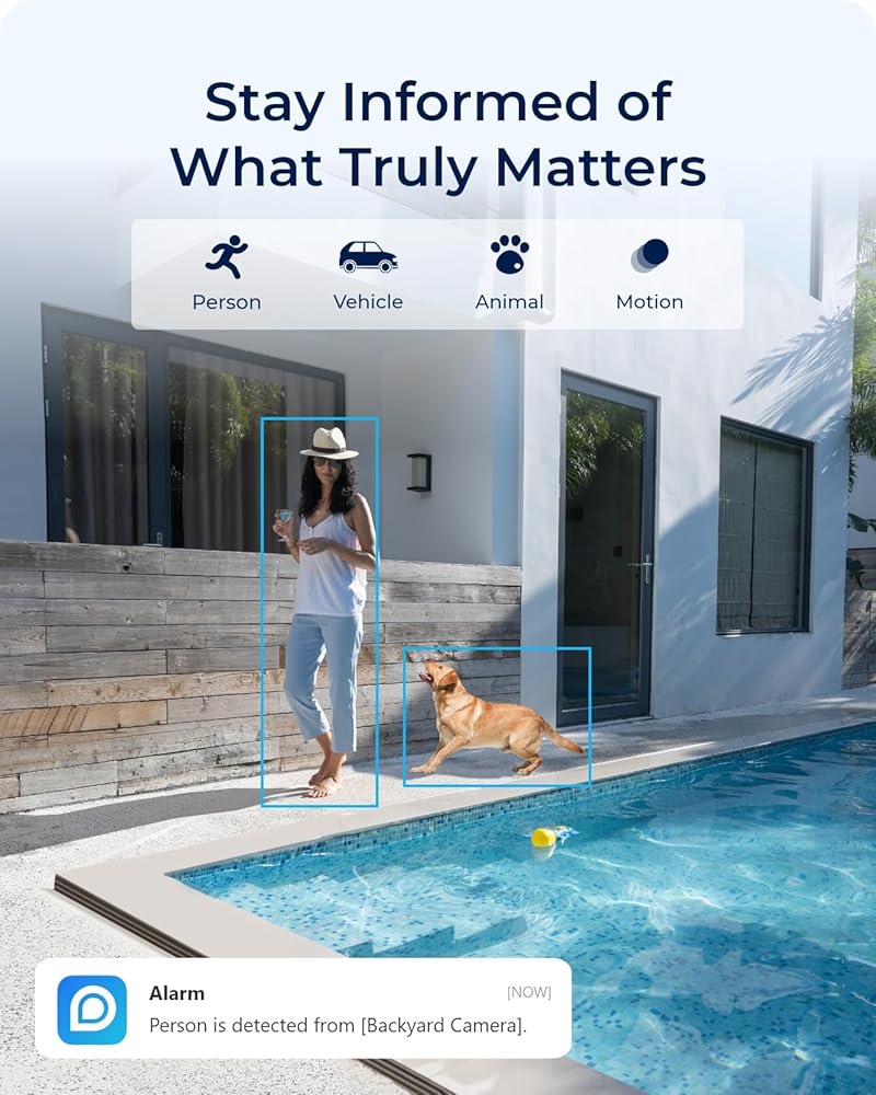 Smart Detection Reduces False Alarms: Equipped with an advanced sensor and intelligent algorithms, this battery camera brings more accurate alerts, and you can set the detection sensitivity and zones for person/vehicle/pet motion to further reduce unwanted alerts.