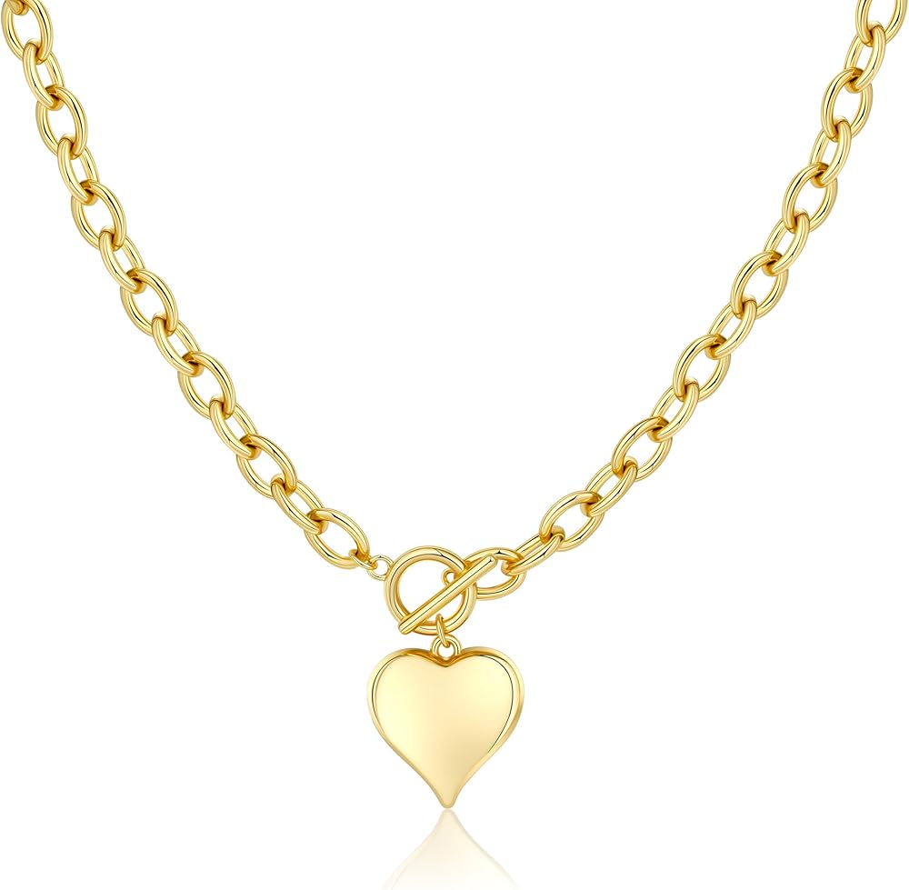 Heart Necklace: The gold heart necklace features a thick chain design and a gold heart pendant, This gold heart necklace makes a bold statement with its a large puffy heart charm and thick cable chain link