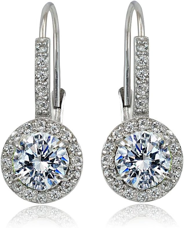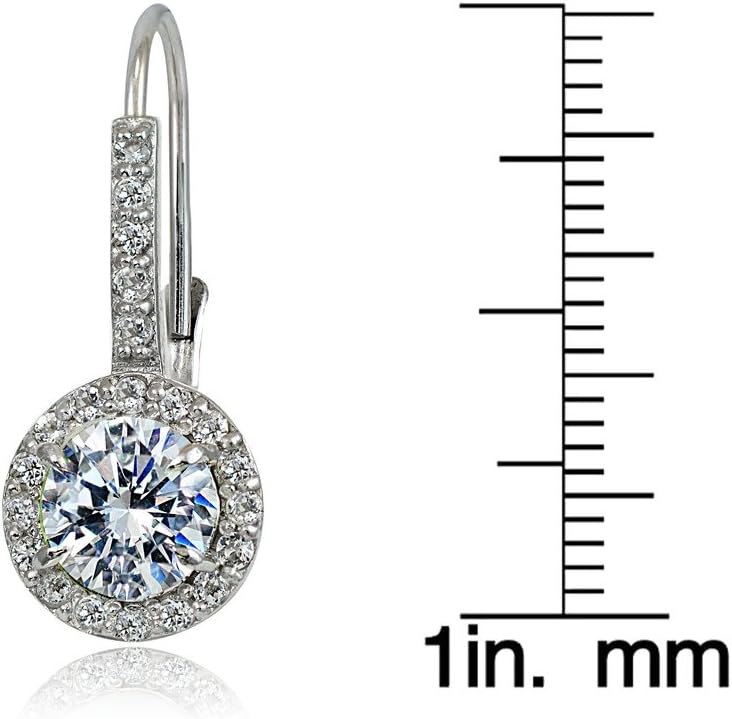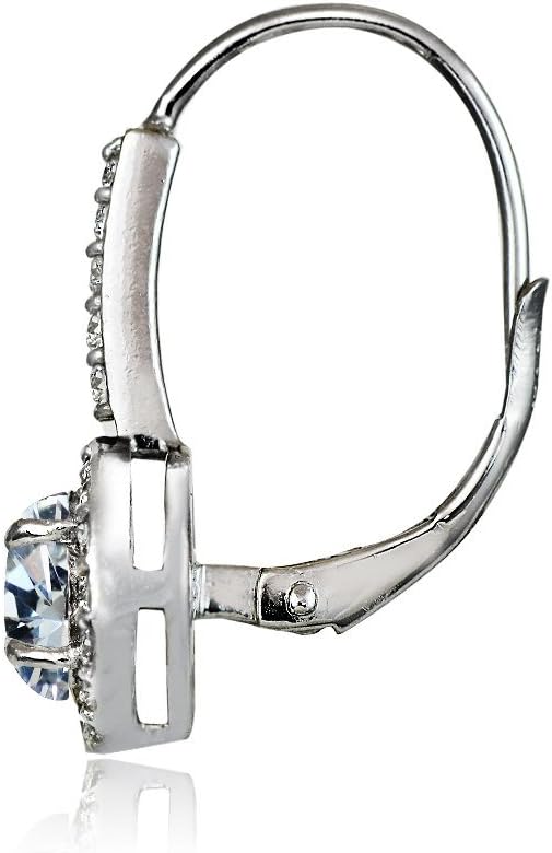 These beautiful drop earrings feature 6mm round shaped stones surrounded by smaller white topaz stones. The earrings are secured by lever-backs and are crafted of sterling silver. Available in 12 Colors