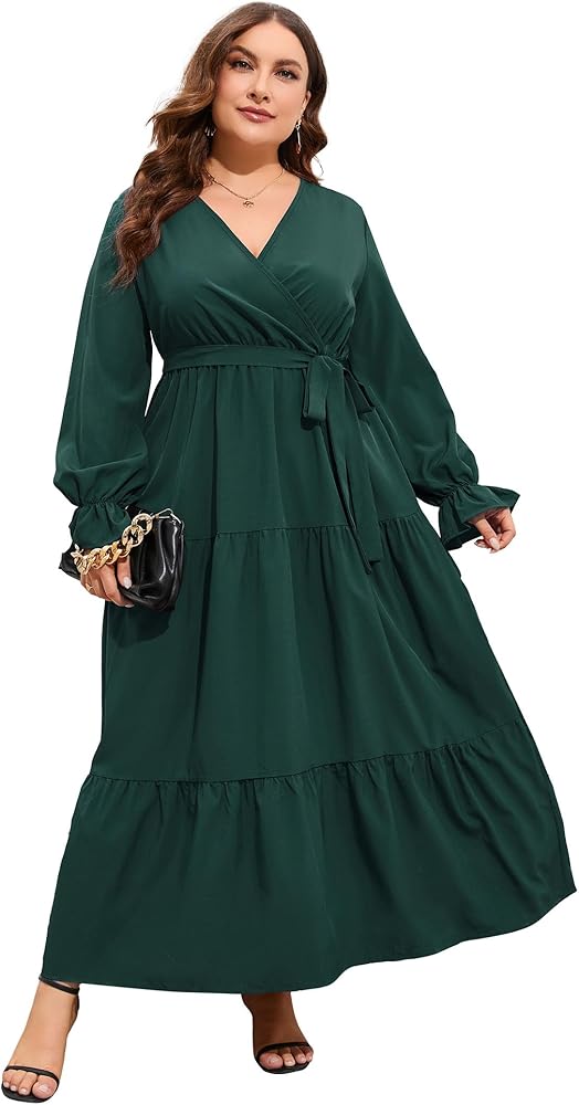 This plus size women's maxi dress falls above the ankle and features a faux wrap design, v-neckline, long sleeves, elastic high waist with belt ties to create a bowknot, and a ruffle and pleated hem.