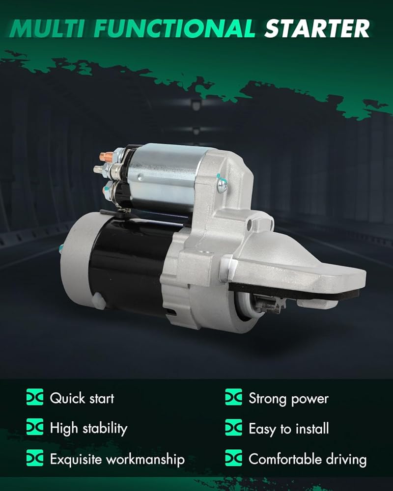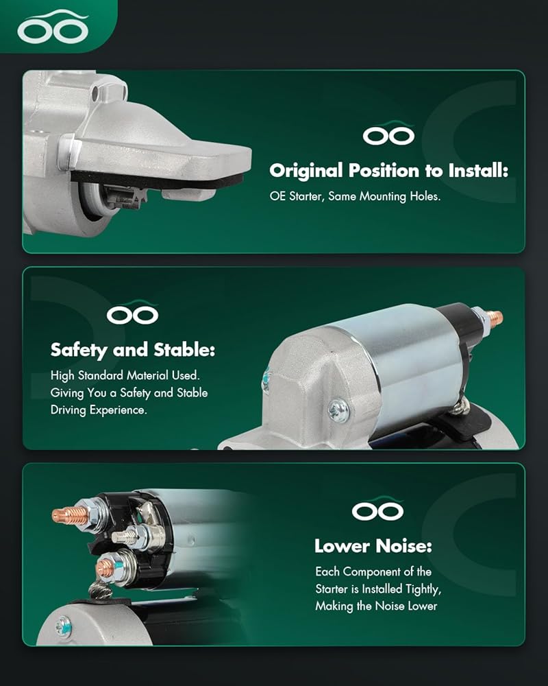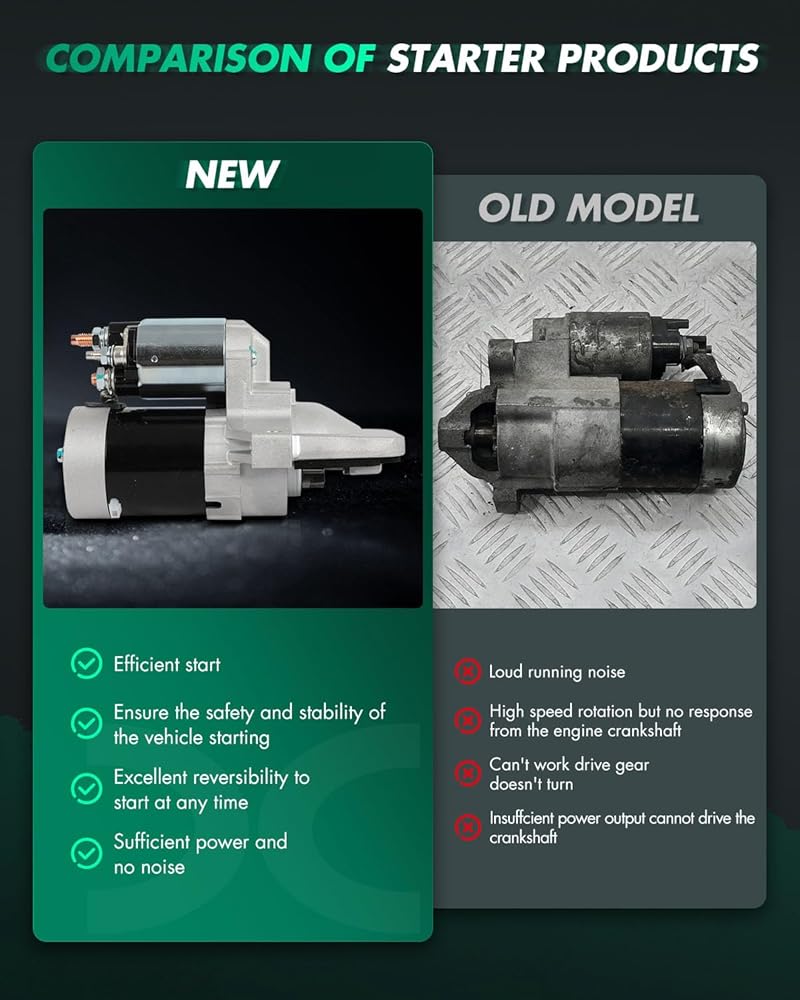 Premium Quality Starter Motor - The precision manufactured gears are finely processed with carbon steel, making them less prone to slipping during start-up and capable of quickly driving the engine for efficient operation; The Premium-quality composite metal rotor and 100% genuine material thick pure copper coil have stable and durable performance, outstanding quality, and stronger power
