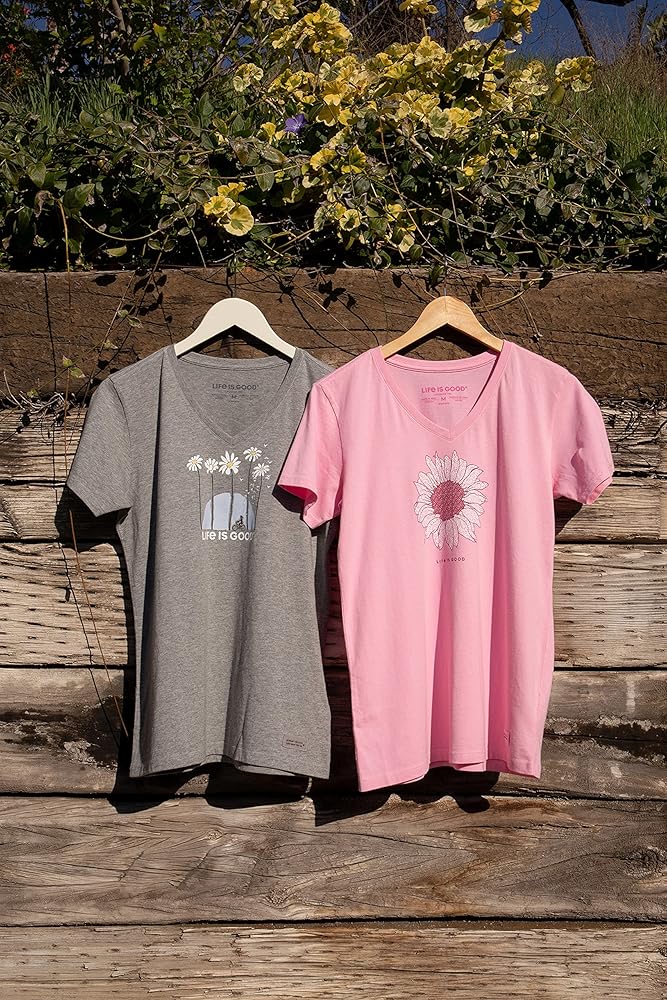 Discover the Life is Good Women's T-Shirt, a perfect fusion of comfort, style, and positivity. Crafted from pre-washed 100% USA-grown cotton, these tees offer a soft, cozy feel for daily wear. The Crusher design provides a relaxed, stylish look ideal for any occasion. Each graphic inspires adventure and good vibes, making it a spring and summer must-have. 10% of profits support children in need, amplifying the brand's message of love and optimism. Embrace optimism and make a difference with Life is Good!