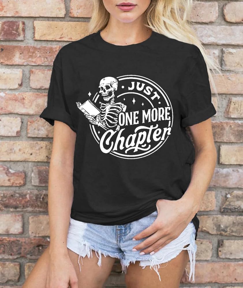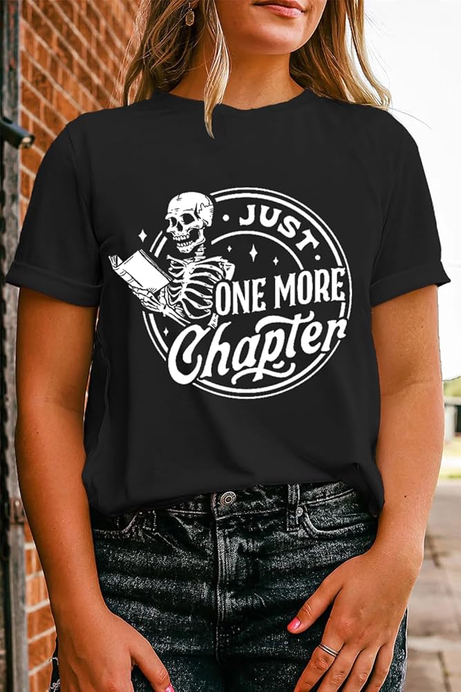 PACKAGE INCLUDING-1*Skeleton Reading T-Shirt/Just One More Chapter Shirt.You can easily match this skeleton reading shirt with the outfits in your closet.