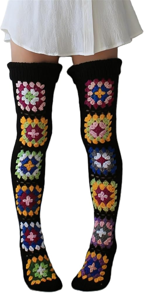 Vintage-Inspired Design: These over-the-knee socks feature a trendy Y2K aesthetic with a nostalgic "granny square" crochet pattern in vibrant, mixed colors, adding a playful, retro touch to any outfit