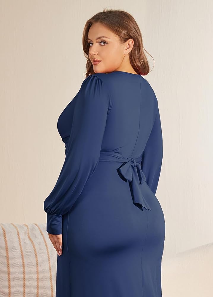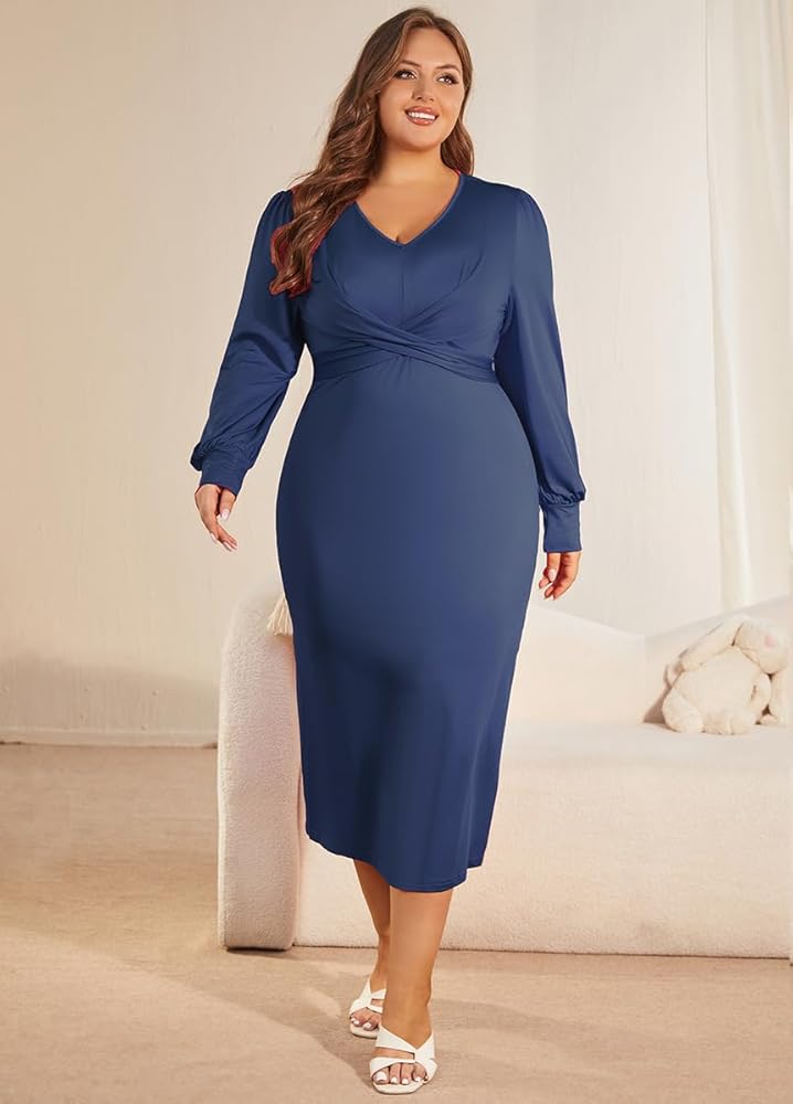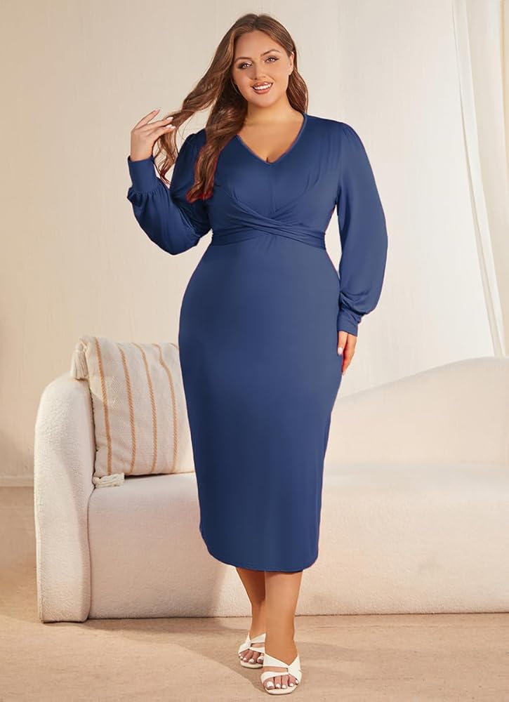 【FEATURES】Plus size wrap dress, sexy v neck, long sleeve, solid color, criss cross wrap, high wasit, bodycon midi dress.