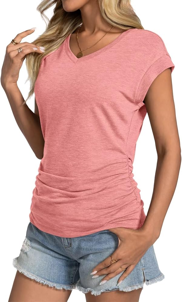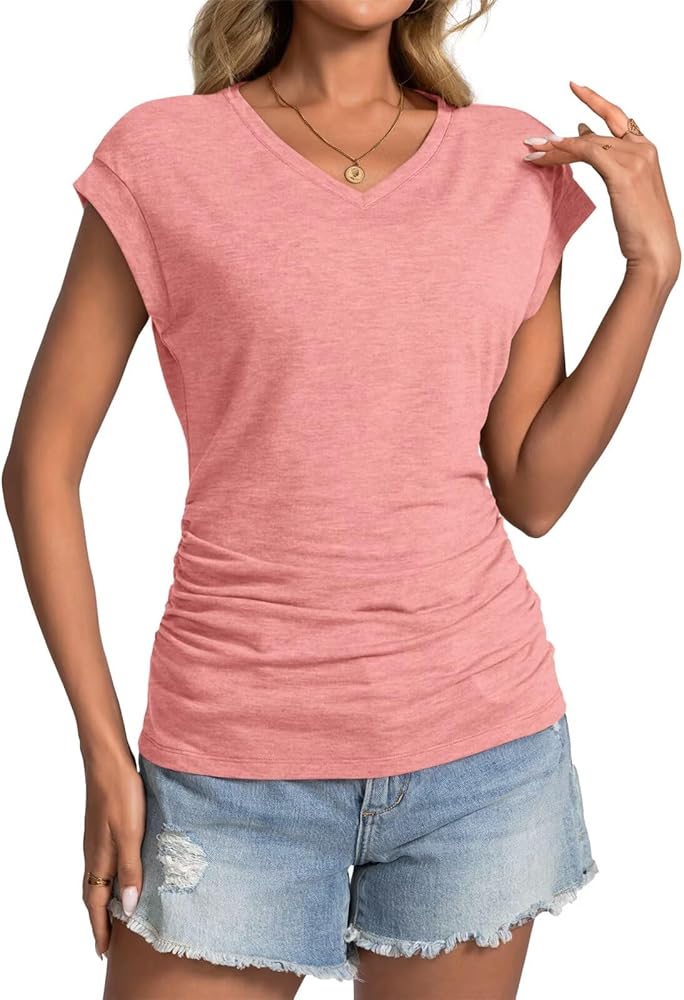 Women's Ruched Tops Features: Cute V neck t shirts for women, cap sleeve tops, side ruched and loose fit design, solid color, suitable for both dressy and casual, trendy top for women 2025, basic summer tops