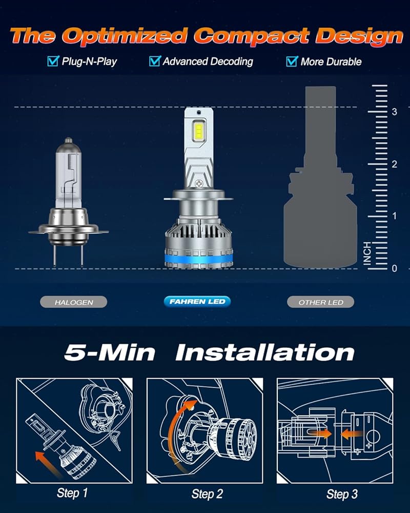 Precision Beam Design: Featuring an ultra-thin profile that positions the chips closer together, these H7 fog lighting bulbs produce a focused beam with wider and longer-range illumination. This design eliminates glare and dark spots, ensuring a safer driving experience.