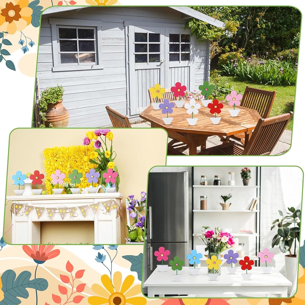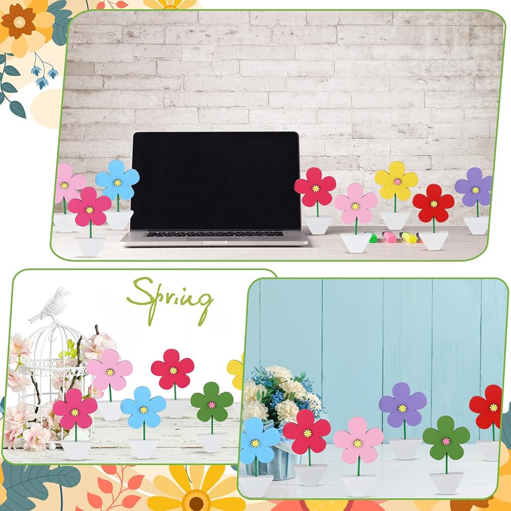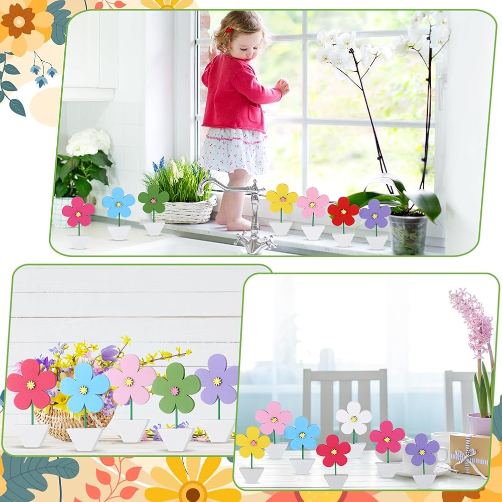 Wenqik 10 Pcs Spring Decorations for Home Wooden Daisy Decor Spring Tiered Tray Decor Colorful Flower Statues with White Pot Base Daisy Centerpiece Perfect for Easter Home Shelf Mantel Decoration